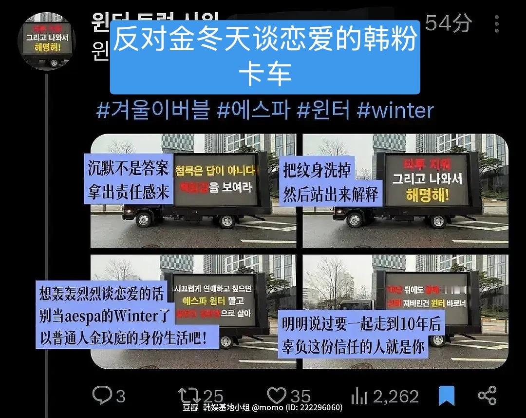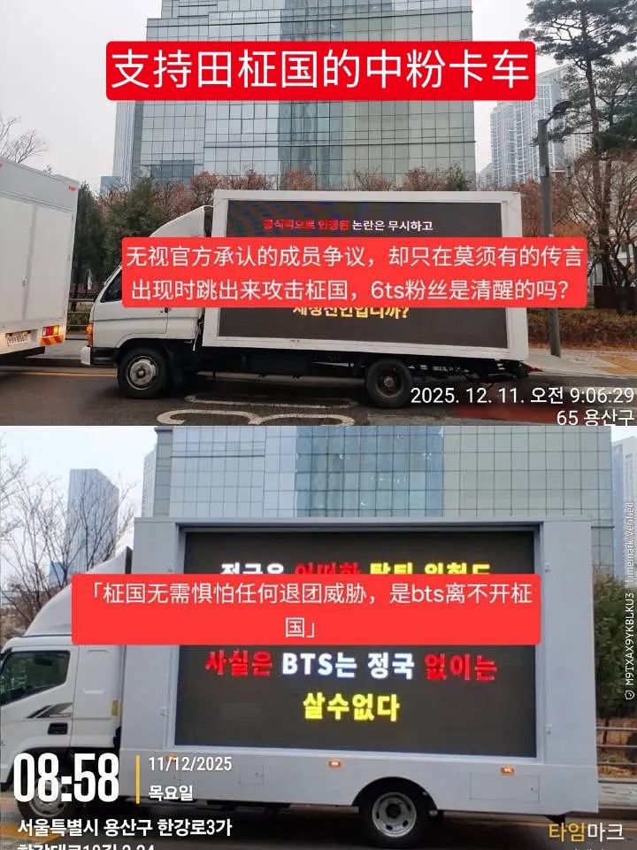 今天 SM 和 HYBE 门口好热闹支持田柾国和金玟庭的和要他们分手的卡车全部都开到门口了 韩粉和中粉态度对比强烈 说好的中式教育呢?aespa粉丝要求金冬天把情侣纹身洗掉aespa粉丝向金冬天卡车示威 田柾国中饭卡车维权