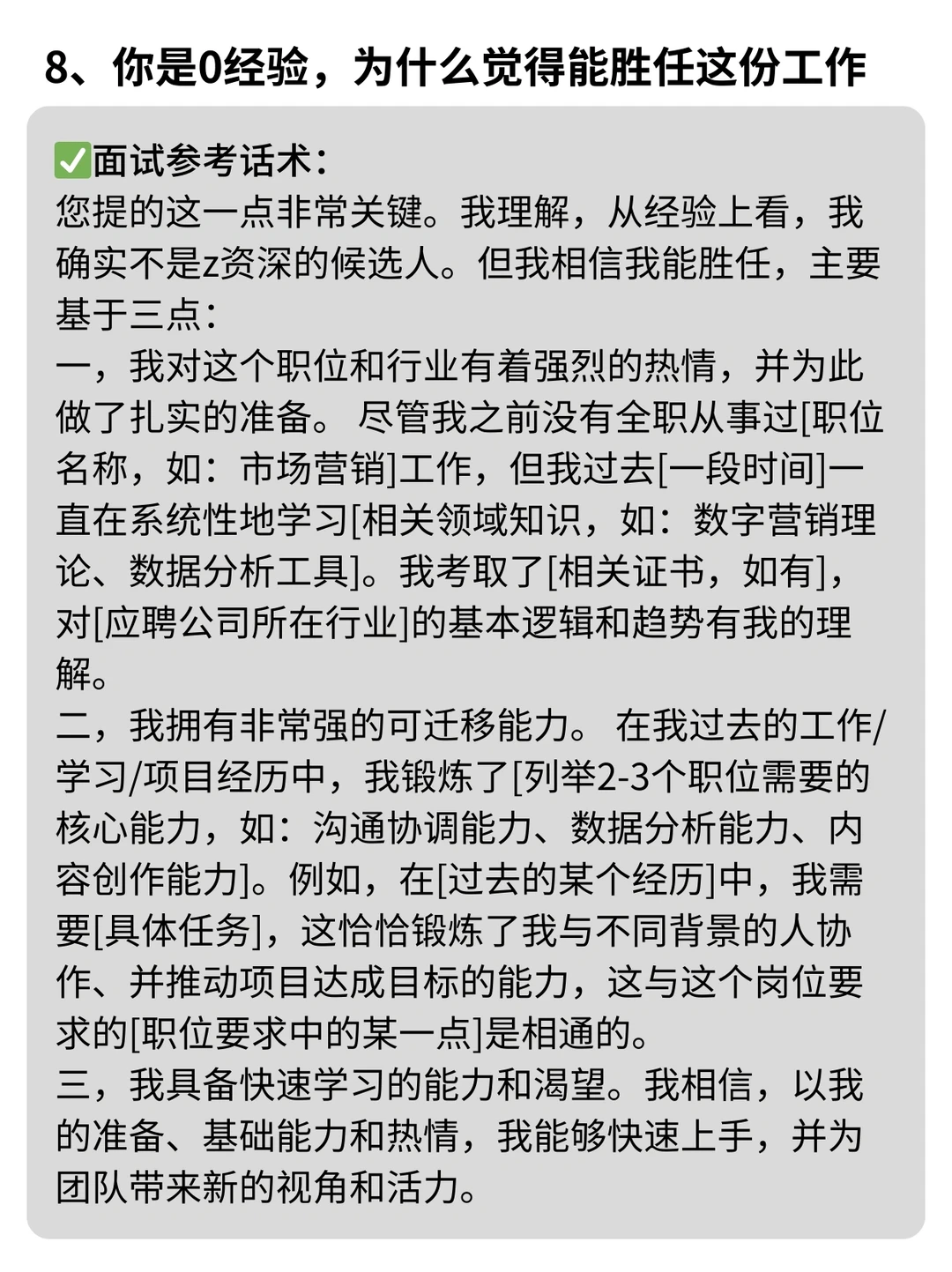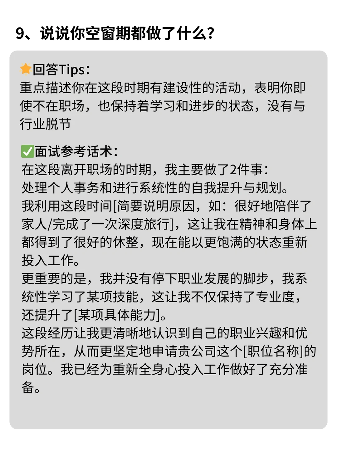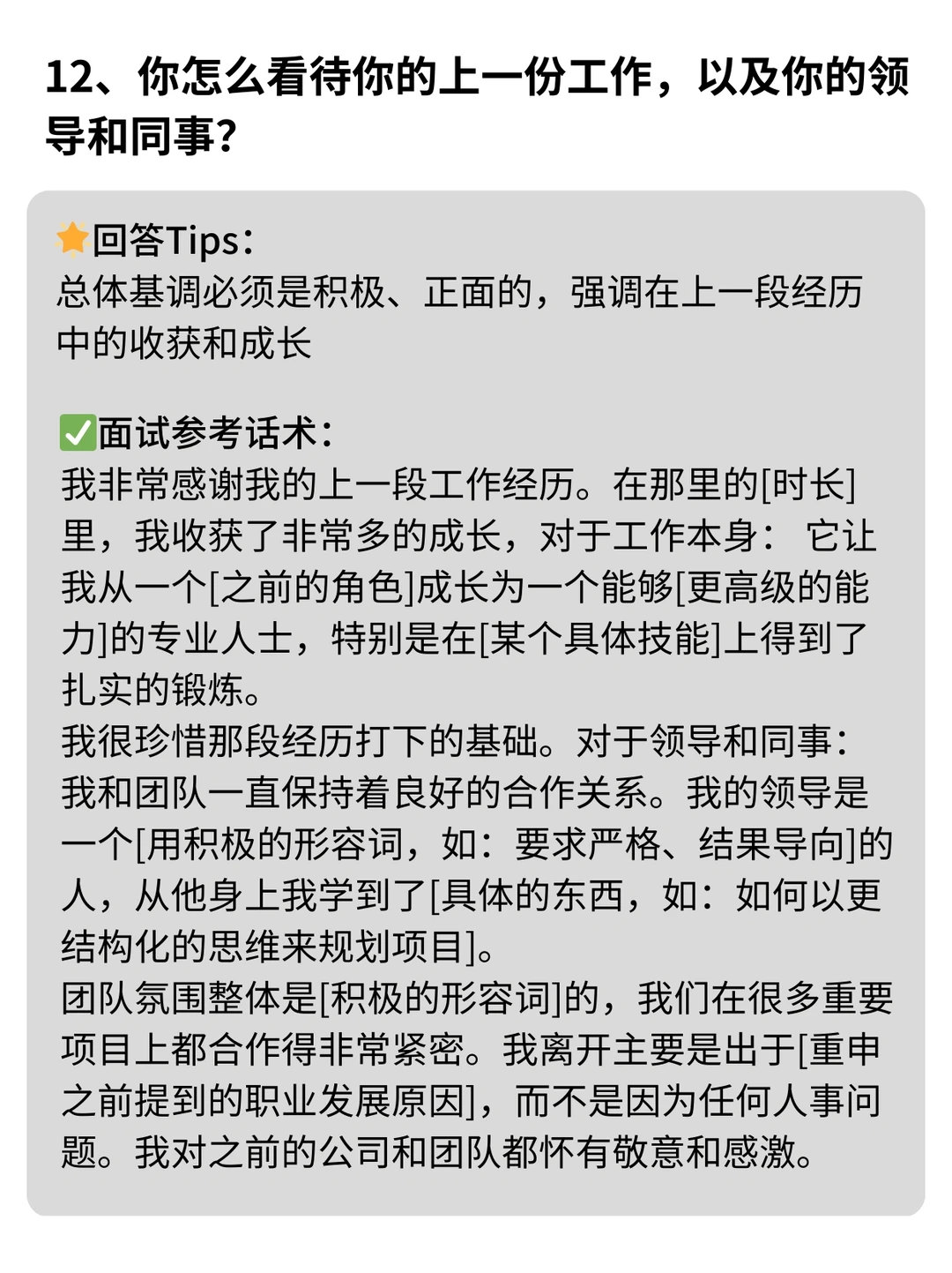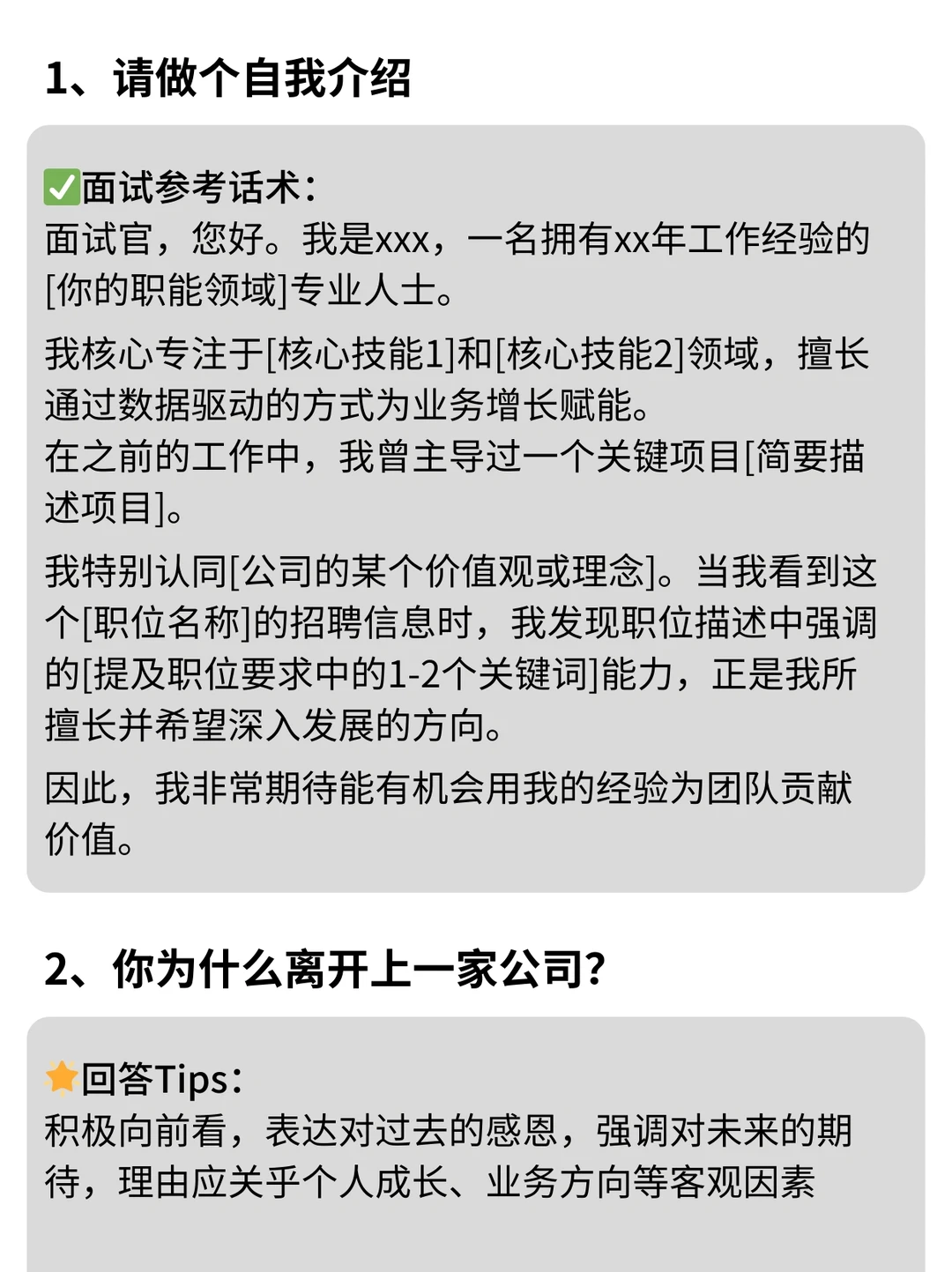 年底其实是找工作的“轻松模式”!虽然开放的岗位可能没那么多,但每个岗位基本都是急招,诚意满满 · 因为大多数人都想着“等过完年再说”,现在去面试,竞争小、要求也更灵活,简直是自带加速buff一样的机会✨ · 不如悄悄行动起来,面试前花点时间看看经验贴,理清自己的优势,把常见问题准备好回答思路(不用硬背),年底就能收获一份满意的offer啦! · ✅外企高频面试问题,面试参考话术👀看上图‼️ 1、请做个自我介绍 2、你为什么离开上一家公司? 3、你为什么对这个职位和我们公司感兴趣? 4、你的职业目标是什么?未来3-5年你有什么规划? 5、你如何看待加班和工作压力? 6、你z大的优点是什么? 7、你z大的缺点是什么? 8、你是0经验,为什么觉得能胜任这份工作 9、说说你空窗期都做了什么? 10、请分享一个你过去工作中遇到的z大挑战或失败,以及你是如何应对的 11、你过去有成就感的一个项目或成绩是什么? 12、你怎么看待你的上一份工作,以及你的领导和同事? ✅以上,面试参考话术👀看上图‼️ · 🙋‍♂️我是瑞池,500强外企面试官 👉(求职版) 分享外企求职干货,和我一起入职外企! -