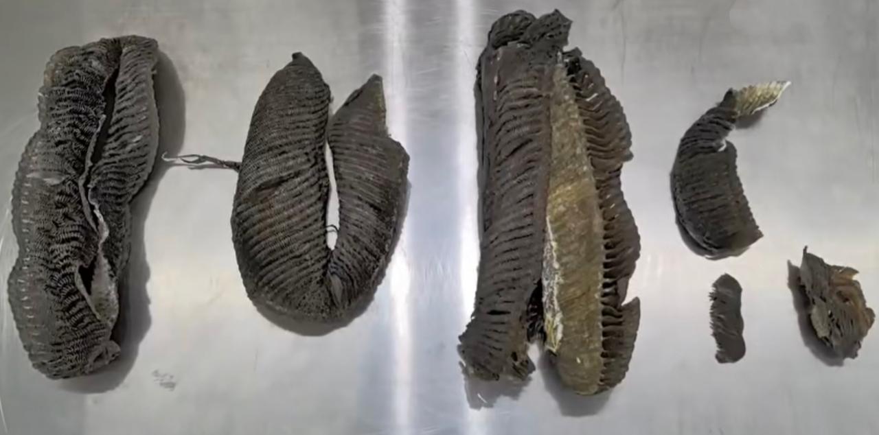 拦截了!深圳福田口岸,一名进境男子的行李,机检显示,里面有细密的梳齿状物品,密度不同于平常物品,开箱一查,果断扣下! 工作人员从男子的包里,掏出一个塑料袋,里面装着6块黑乎乎的东西,散发着腥味,上面布满细密的梳齿,共重1.2斤。 经过鉴定,这些东西是蝠鲼属物种制品,是纳入濒危物种名录的,没有合法证书,不能随便携带进出境。 我查了一下,蝠鲼不是一种鱼,而是一个科几种鱼的统称,因为在海里游起来,就像飞行的蝙蝠,因此得名。 这类鱼体型大,可以长到七八米,但是很温和,只吃浮游生物和小鱼,因为它的腮被认为可以入药,因此数量不断减少,已经被列入保护动物。 这些东西又叫膨鱼鳃,民间传说可以用来煲汤,喝了对肺好,其实这种说法,没有什么科学依据。 而且,鱼腮是起过滤作用的,里面少不了一些有害物质,还是少吃为妙。