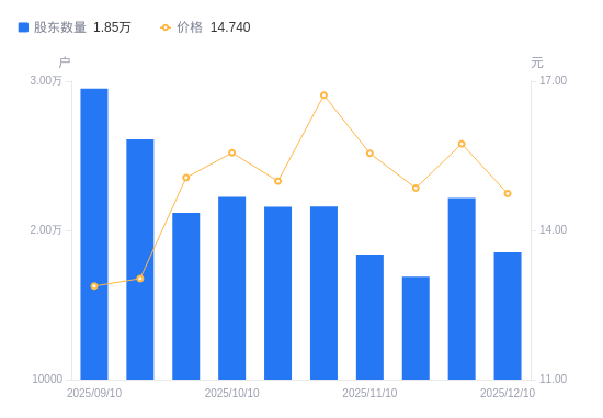 日期A股户数(户)流通A股户均持股数(股)户均持股市值(万元)2025-12-10185379154.8713.492025-11-28221617657.7712.052025-11-201689210046.4114.922025-11-10183859230.5614.352025-10-31215957858.4813.142025-10-20215857862.1211.792025-10-10222447704.0911.992025-09-30211838089.9712.182025-09-19261127416.939.662025-09-10294986565.568.46