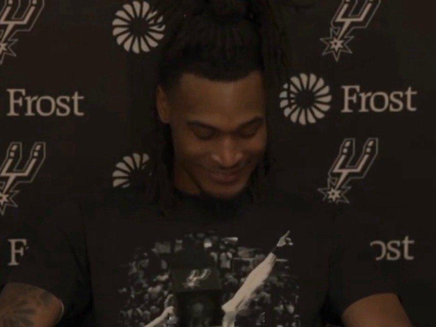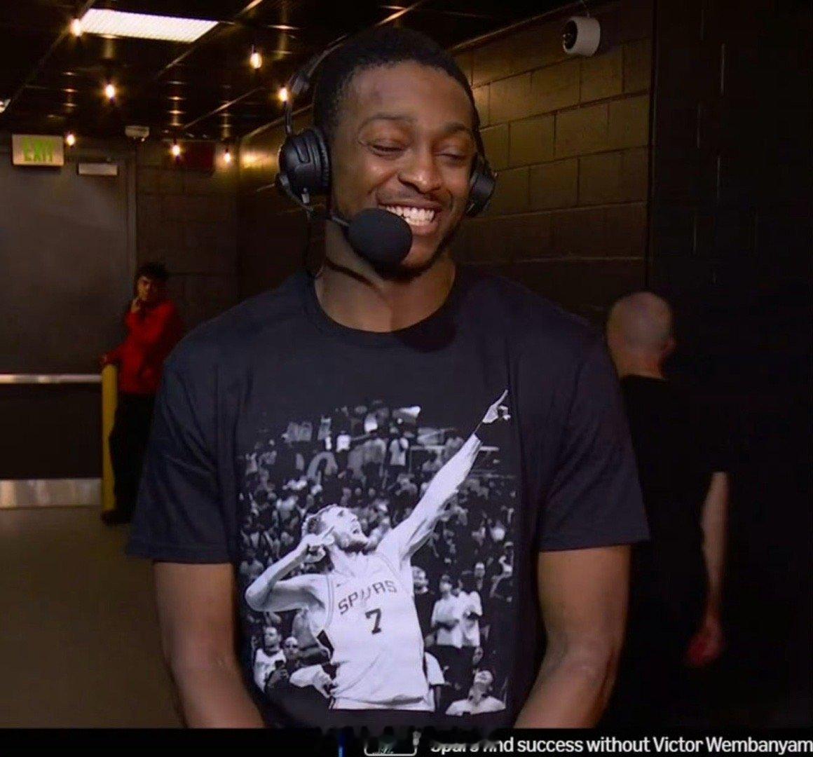 本场赛后的采访环节,福克斯和卡斯尔都穿上了此前科内特的庆祝姿势的T恤马刺淘汰湖人