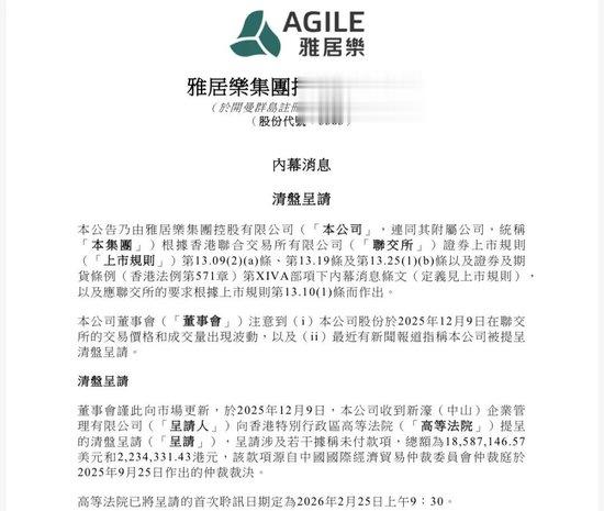 近日,雅居乐(03383.HK)公告称,公司于12月9日收到新濠(中山)企业管理有限公司(下称“新濠中山”)向香港高等法院提出的清盘呈请,涉及总额约1858.71万美元和223.43万港元的未付款项。