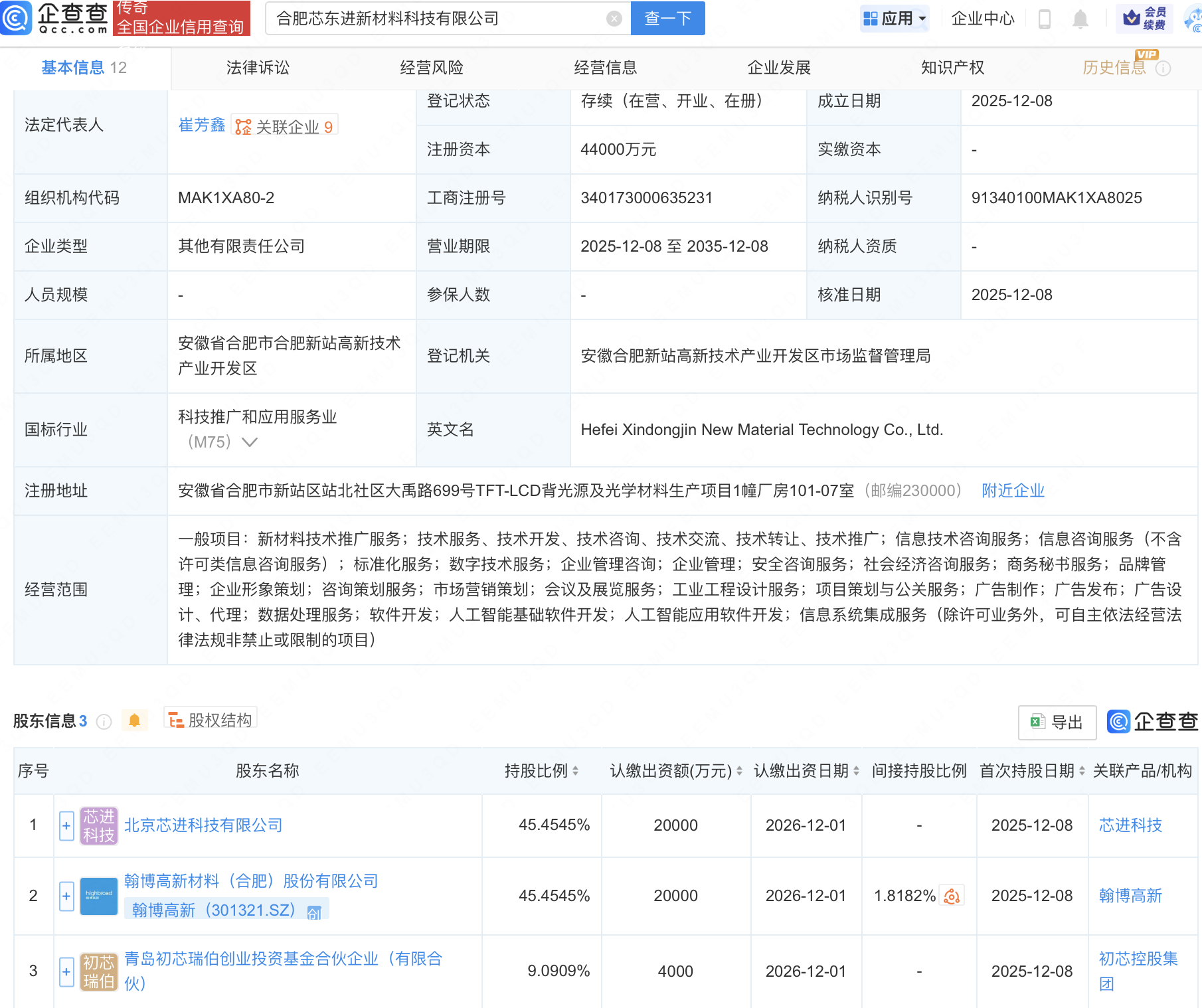 企查查APP显示,近日,合肥芯东进新材料科技有限公司成立,注册资本4.4亿元,经营范围包含:软件开发;人工智能基础软件开发;人工智能应用软件开发等。企查查股权穿透显示,该公司由翰博高新(301321)等共同持股。