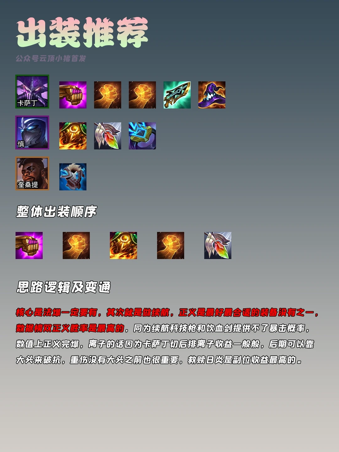 [氛围感R]装备思路:核心是法爆一定要有,其次就是做续航,正义是最好最合适的装备没有之一,数据榜双正义胜率是最高的。