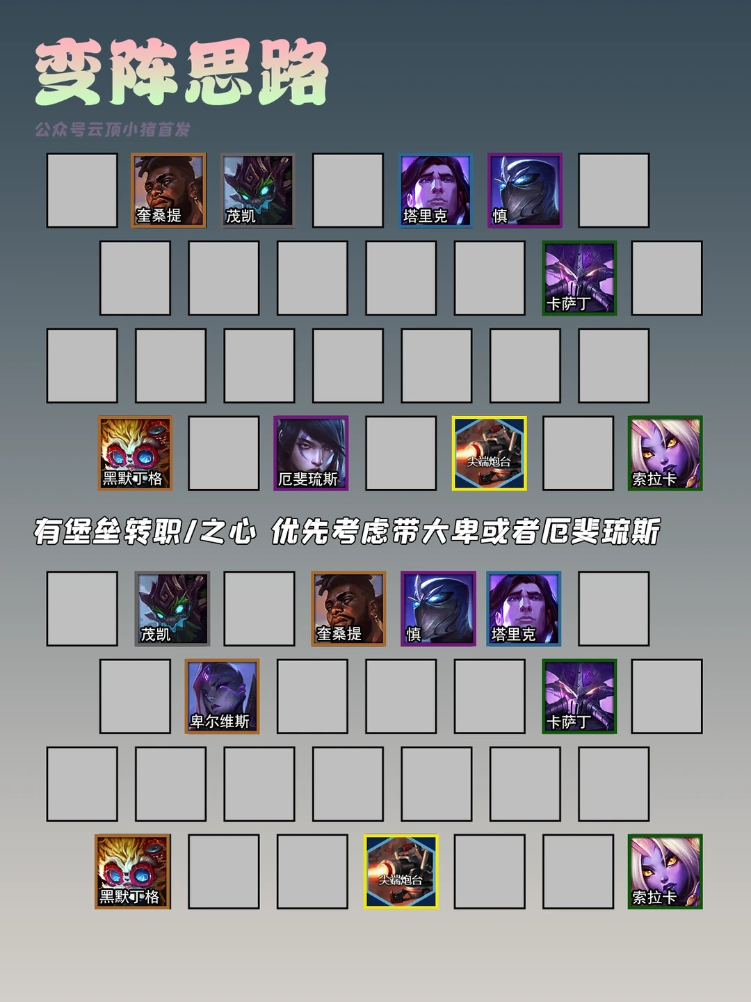 基本站位、调整卡萨丁切人位置就好,也可以放第一排,第二排是不容易被第一时间锁头而已。