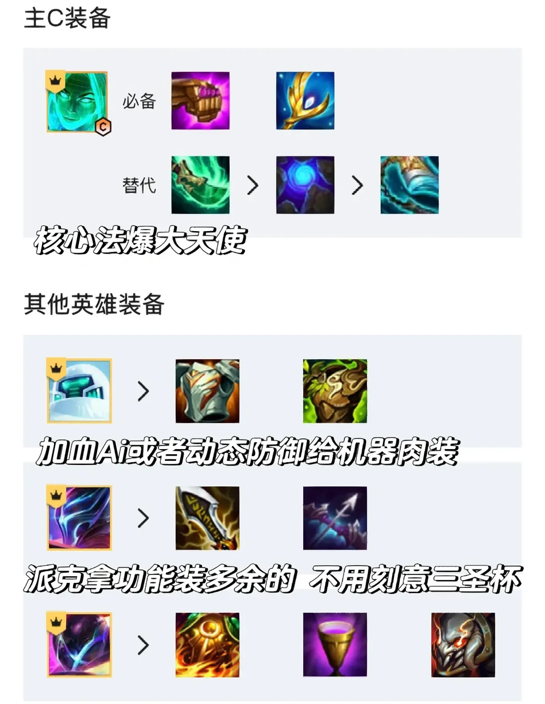 [氛围感R]装备思路:妖姬核心应该是法爆和大天使,第三件做回蓝装吧,要不启动还是有点慢了,派克这个点挺关键的,其实不用全做圣杯,日炎泰坦这些装备都是不错的。