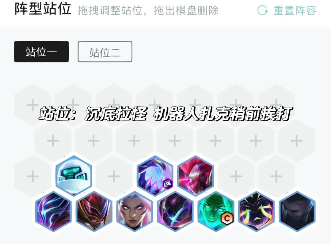 全体沉底哈,这样才能把对面人拉出来妖姬切C位,扎克挨着派克吃黑客开4黑客羁绊,两侧机器人慎稍微靠边吃第一波伤害。