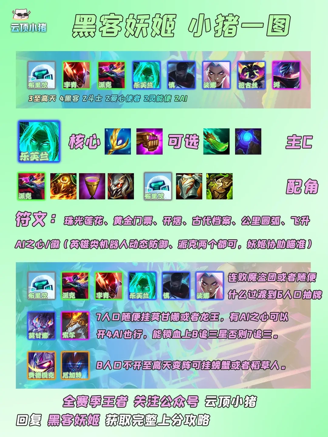 英雄强化:1费机器人动态防御,2费派克两个都可以拿,三费妖姬协助瞄准或者慎的辅助羁绊,高费稻草人或者龙王的。