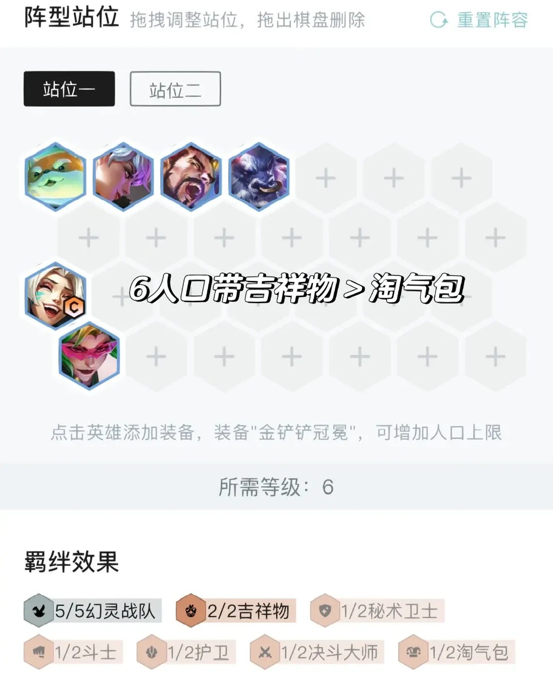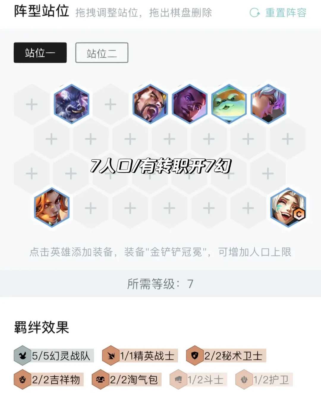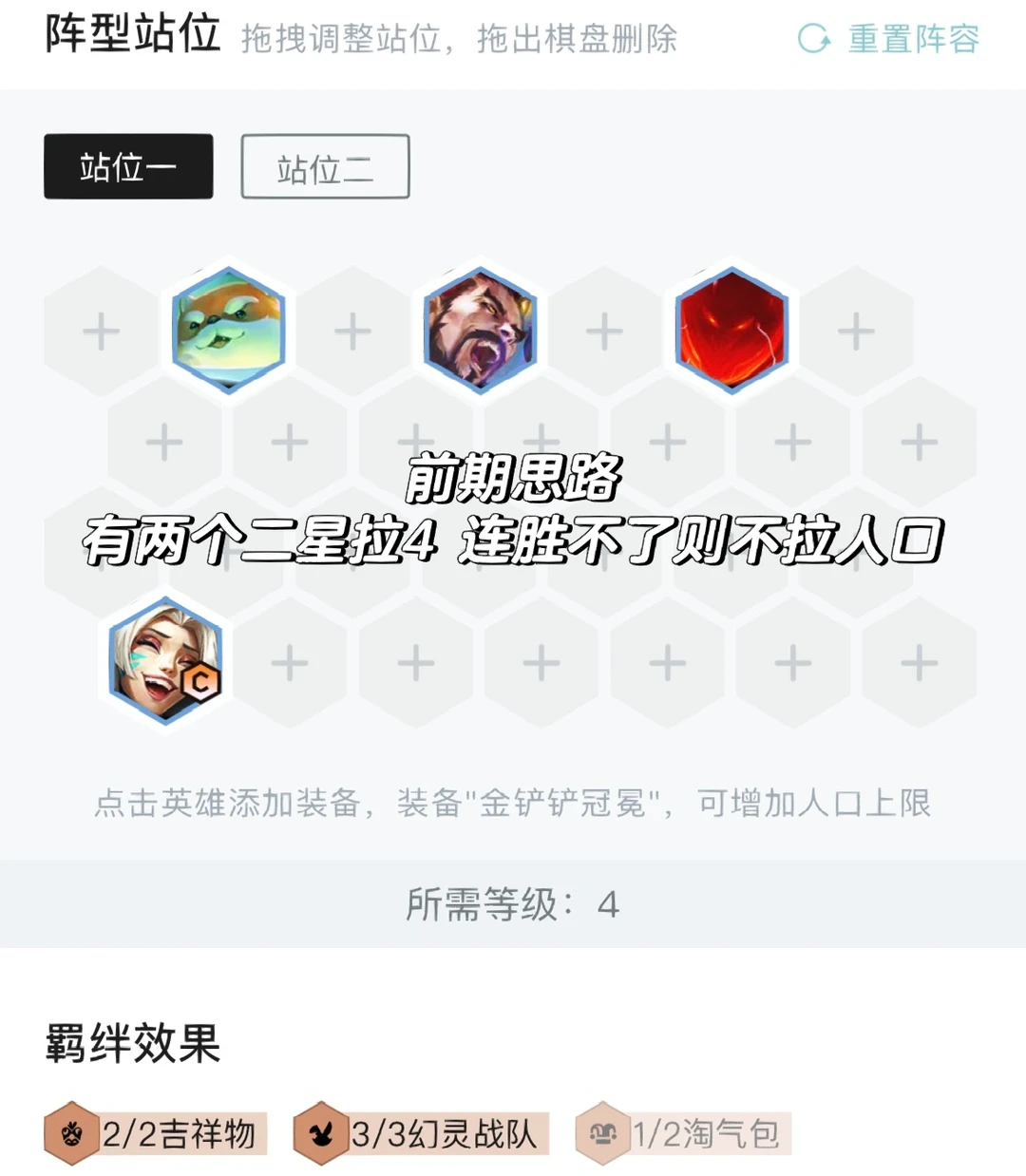 打不了连胜的情况下不拉人口,两个二星开局可以强势拉人开打连胜,5人口需要追出三星狗头或者塞拉斯其中一个,上6追金克斯,然后再开5/7幻灵,后期补橙卡增强整体。