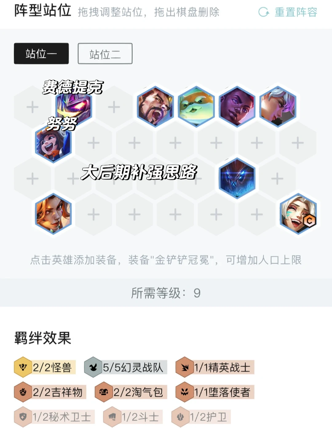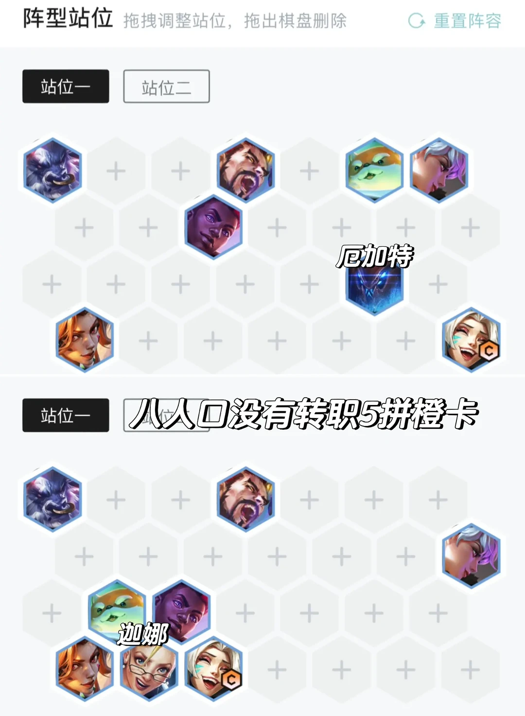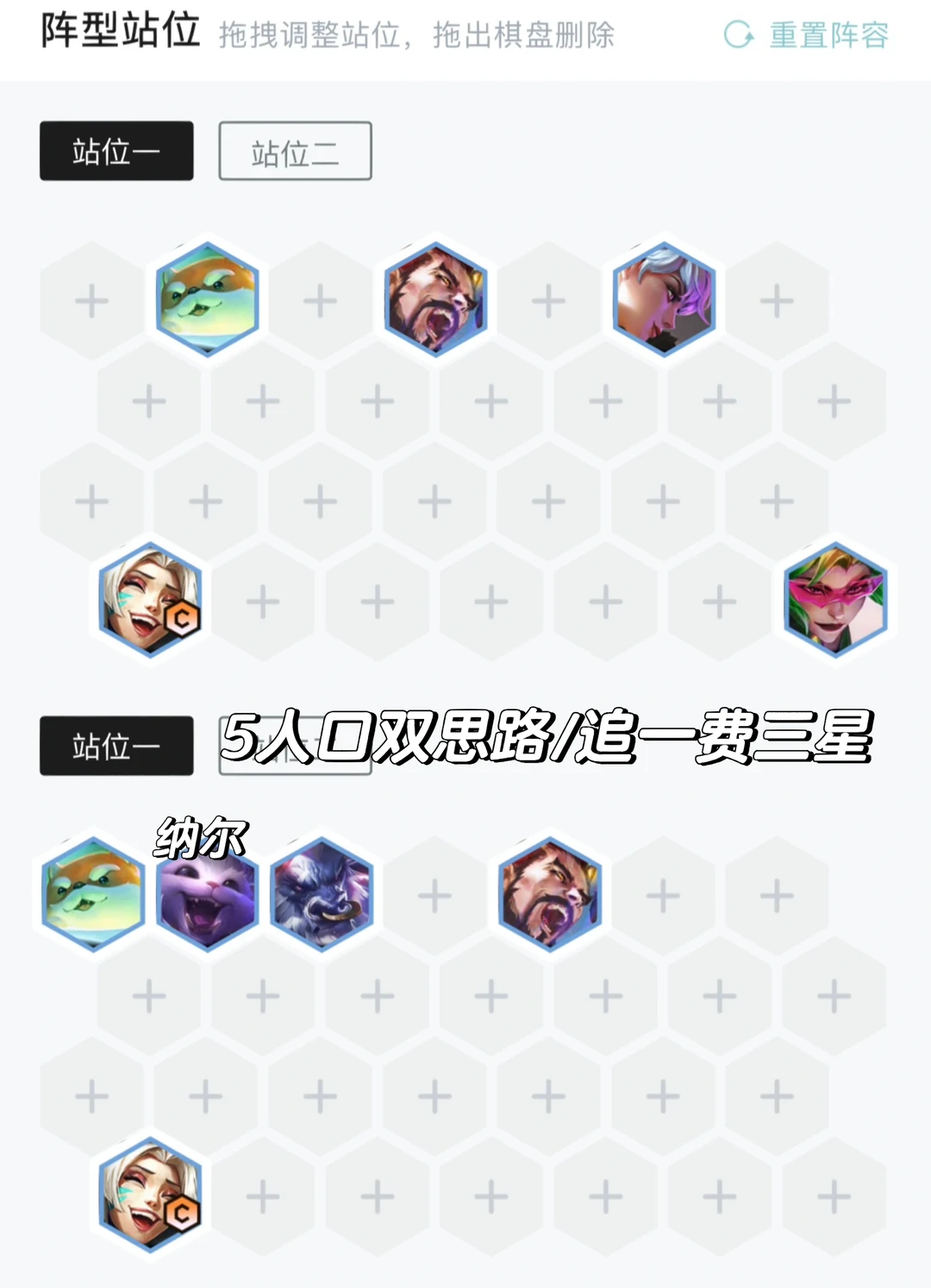 打不了连胜的情况下不拉人口,两个二星开局可以强势拉人开打连胜,5人口需要追出三星狗头或者塞拉斯其中一个,上6追金克斯,然后再开5/7幻灵,后期补橙卡增强整体。