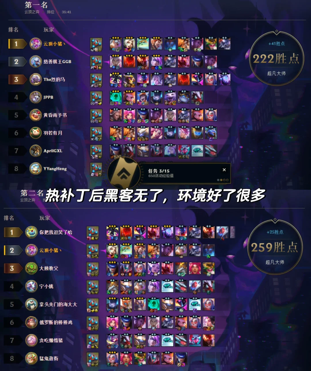 两把第一第二,可以看到都是低费三星的多,这个阵容一定要靠质量,上人口上到9就没实力,三星卡牌打不过我和第一的吉祥物。