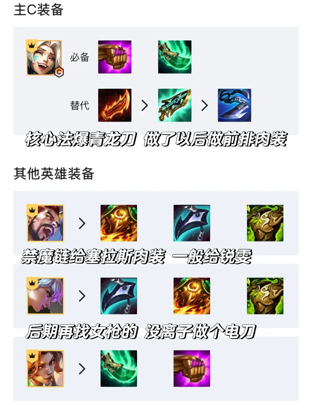 [氛围感R]装备思路:主C金克斯优先法爆青龙刀,第三件不急着做,二件套后先做塞拉斯或者锐雯的肉装,有禁魔链优先给塞拉斯肉装。