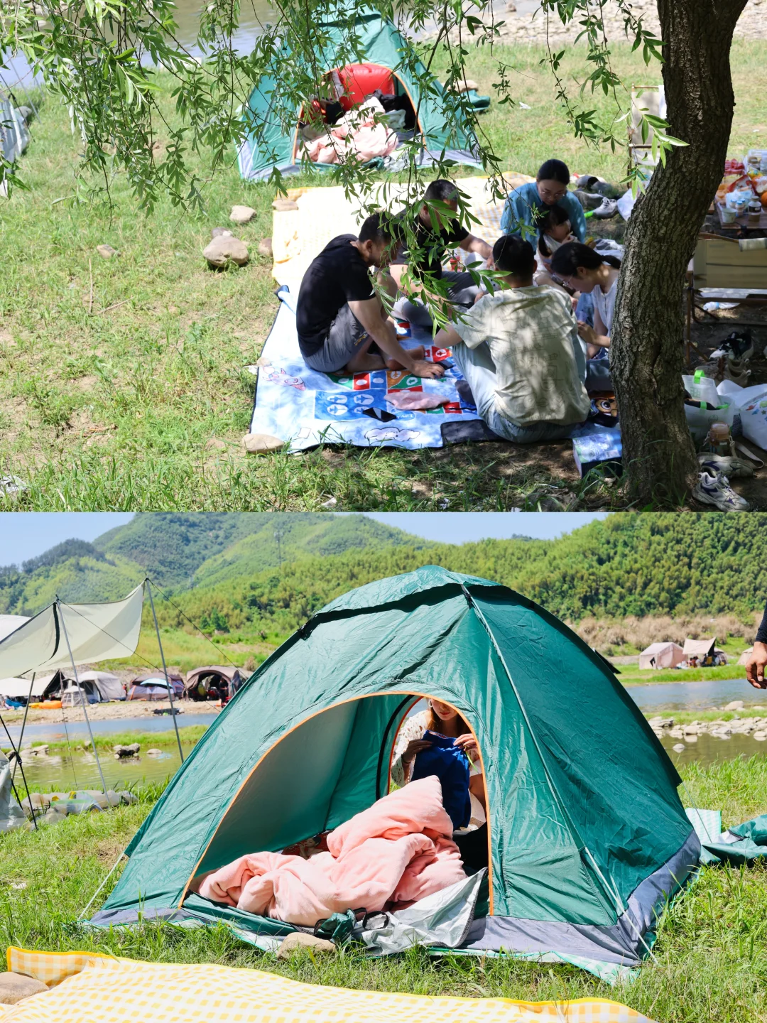 可选择平坦的草坪露营,建议带上天幕,因为太阳晒的时候,帐篷是不管用。