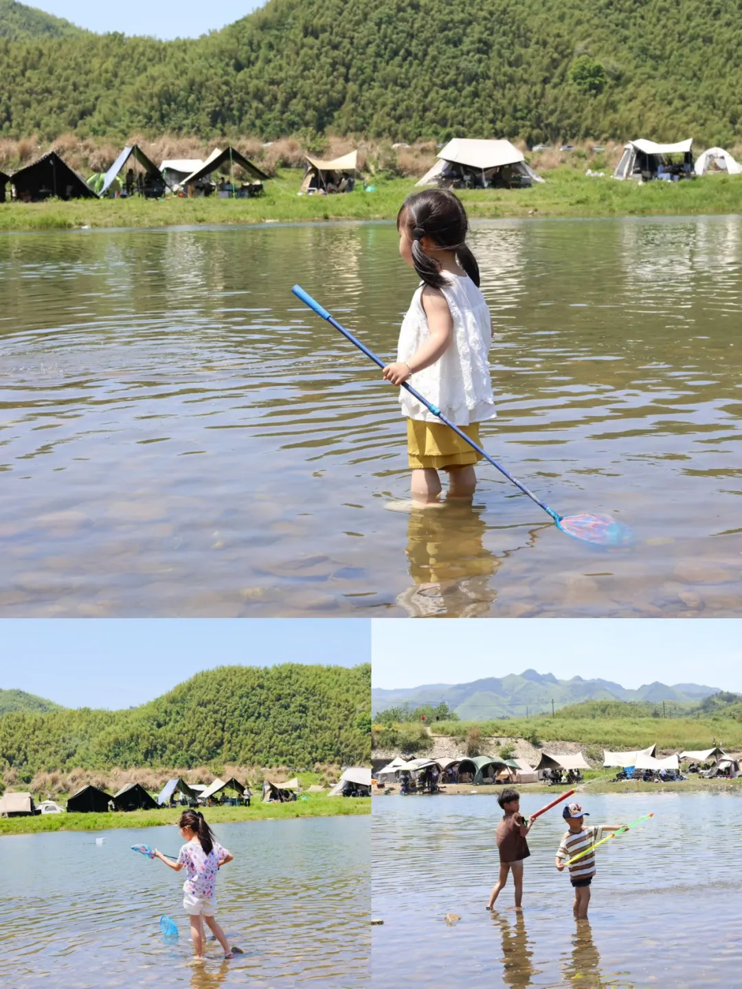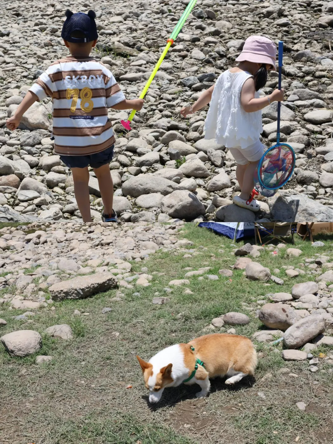 当然草坪和石块两处露营地,隔岸相对,中间流淌着一条小溪,溪水不深,可以下水兜鱼打水仗💦的。
