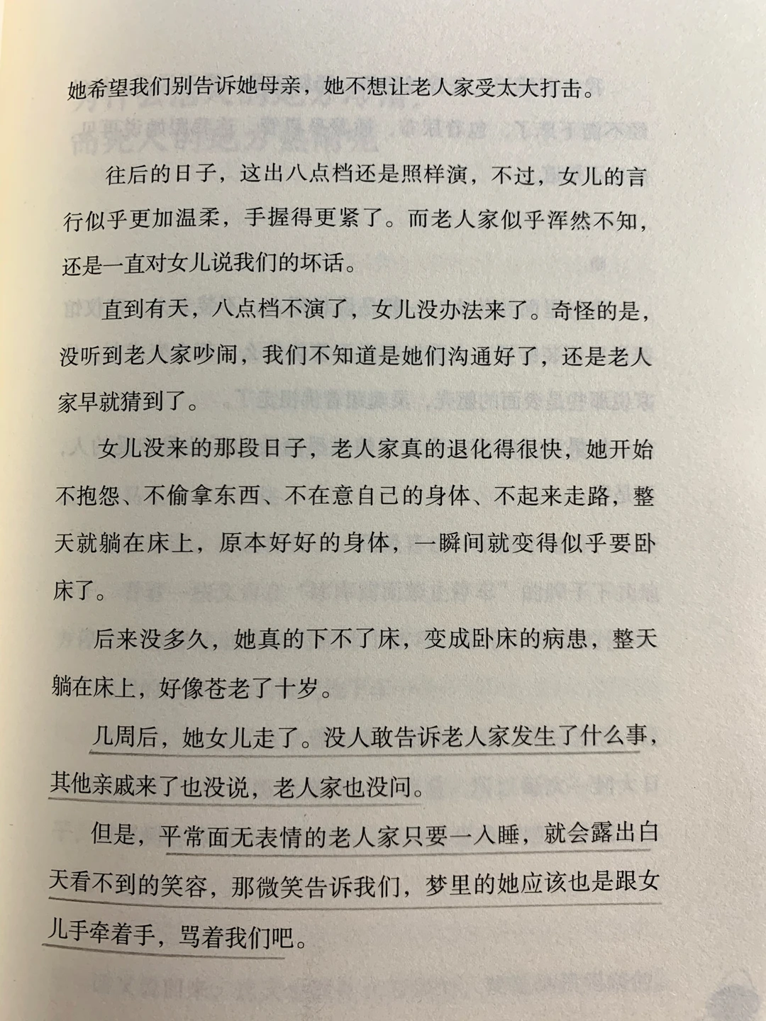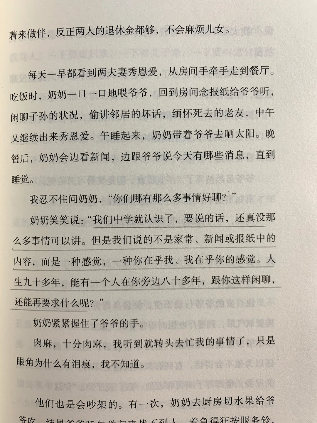 我曾经在护理之家遇到过一对老夫妻,她们每天手牵着手进进出出,有说不完的话,后来我问奶奶怎么会有那么多事情好聊。奶奶说,“我们说的不是家常、新闻或报纸中的内容,而是一种感觉,一种你在乎我、我在乎你的感觉。人生九十多年,能有一个人在你旁边八十多年,跟你这样闲聊,还能再要求什么呢?”