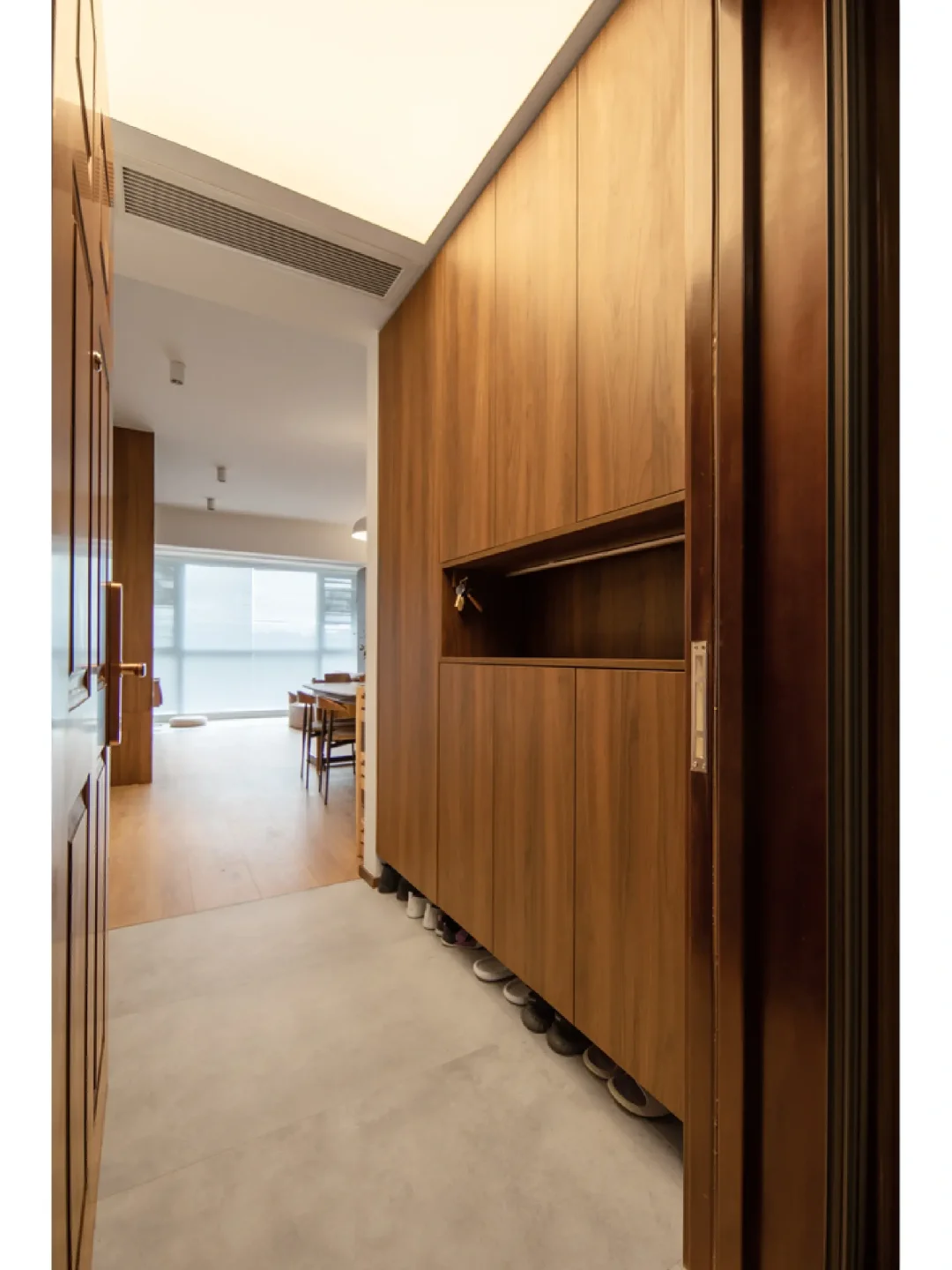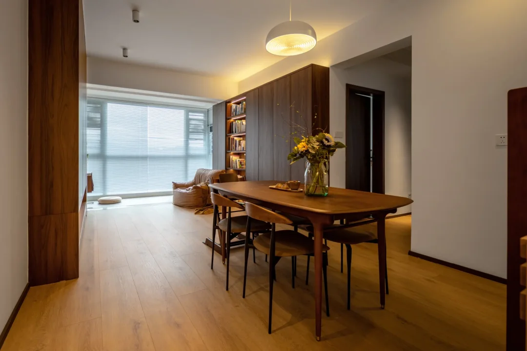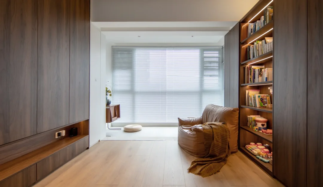 屋子的设计绕开了普遍的精装房风格,更换客厅地砖、去除所有墙面的背景设计、灯槽以及天花板的造型,一切都以干净简洁为主。在满足储物空间的同时,视觉上也不会显得太拥挤,可以留够空间方便小孩玩耍~你觉得怎么样呢~