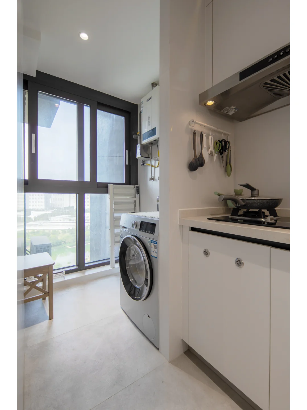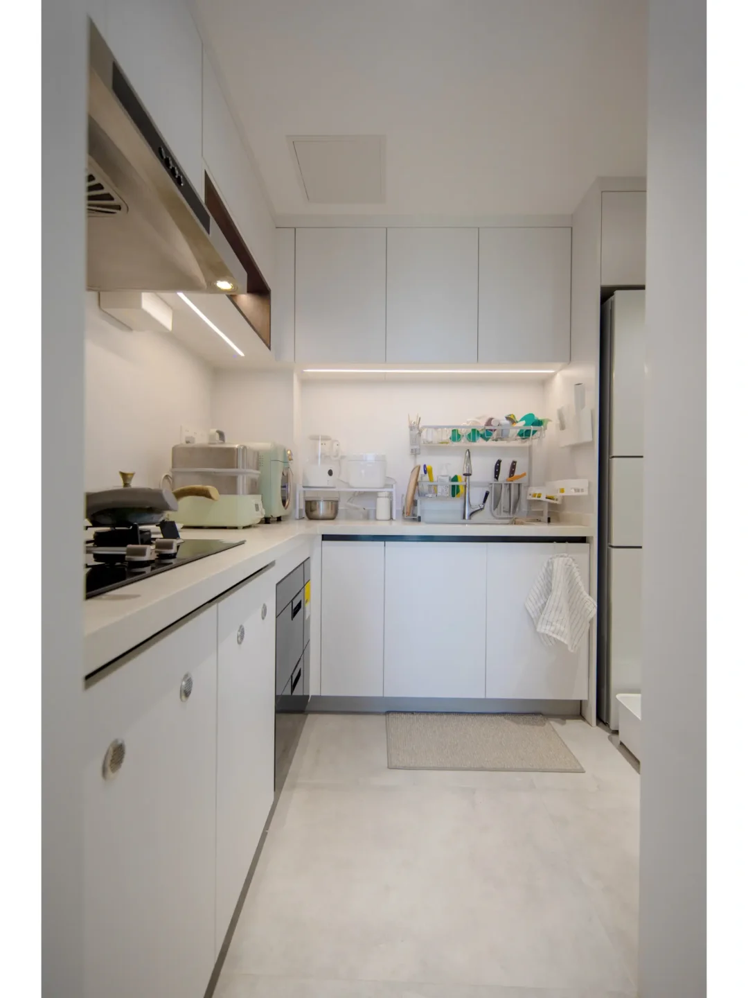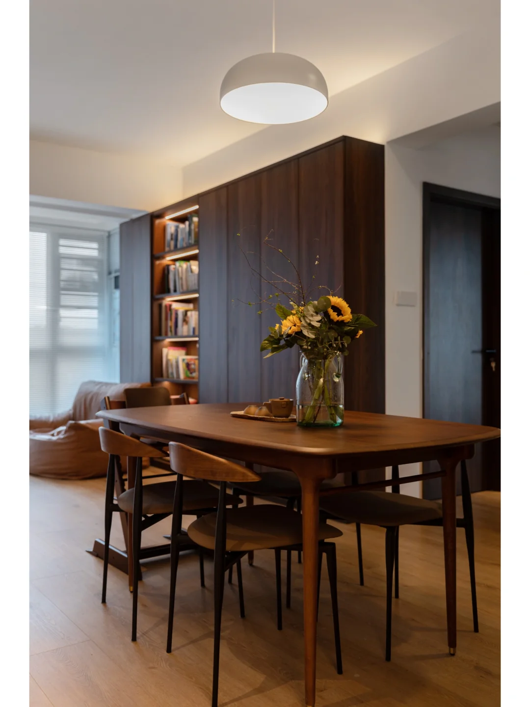 屋子的设计绕开了普遍的精装房风格,更换客厅地砖、去除所有墙面的背景设计、灯槽以及天花板的造型,一切都以干净简洁为主。在满足储物空间的同时,视觉上也不会显得太拥挤,可以留够空间方便小孩玩耍~你觉得怎么样呢~