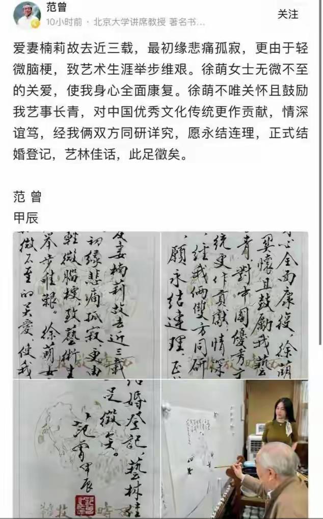 完了,彻底是完了,我得三观崩塌了,87岁的范曾宣布,自己的妻子徐萌产下一独子,并且两人还乔迁了新家,87岁的父亲,37岁的母亲,这老牛吃嫩吃的可真香。 范曾也不知道是被爱情冲昏了头,还是重新获得独子的兴奋,让他有了新的决定,还在网上发布了视频为证。 那视频中范曾说,这家中以后的大小事都要经过妻子来管理,这不就是给妻子放权了。果然妻子生了孩子,87岁的老来得子,肯定要给未来的孩子送上保障。 这还没完,范老师可是声称和自己的亲生女儿和儿子都断绝了关系,那现在他们可是一家三口其乐融融,人家可是过一家三口的小日子。 这小50岁的妻子徐萌不简单,生了儿子就成为范家的功臣,也难怪任谁取了这么年轻的老婆,都希望把自己最好的留给她