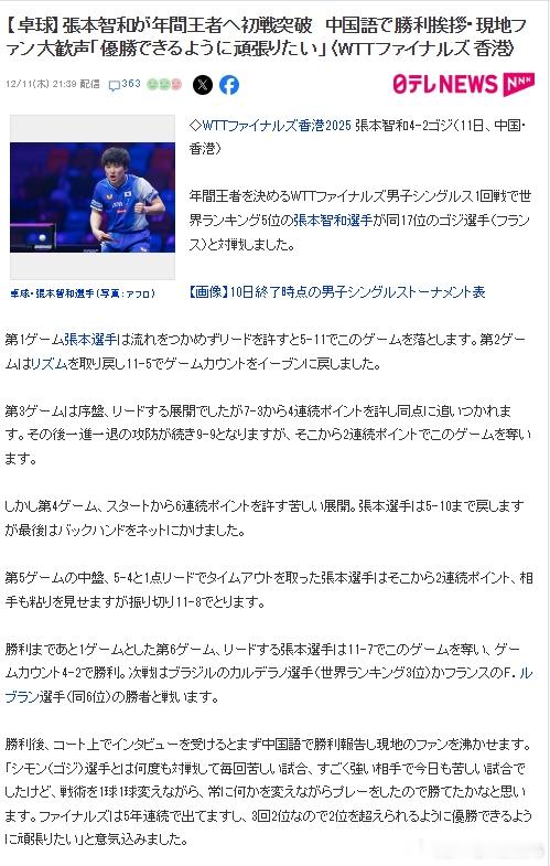 wtt年终总决赛25张本智和 【日媒】 《张本智和闯过年终总决赛首关 中文致胜谢球迷引爆现场 直言 “愿全力拼搏冲击冠军”〈WTT 香港总决赛〉》12 月 11 日(周四)21:39 发布 363评论 363 条·在这场决定年度总冠军归属的 WTT 总决赛男子单打首轮赛事中,世界排名第 5 位的张本智和,迎战世界排名第 17 位的法国选手高茨。首局比赛,张本智和未能掌控比赛节奏,被对手取得领先,最终以 5-11 先丢一局。第二局他迅速找回比赛节奏,以 11-5 扳回一城,将局分扳为 1-1 平。第三局,张本智和在开局阶段保持领先,但在 7-3 的优势局面下,被对手连追 4 分扳平比分。此后双方陷入拉锯战,比分交替上升至 9-9 平,关键时刻张本智和连得 2 分,拿下该局。然而第四局,张本智和开局陷入被动,被对手连得 6 分。尽管他奋力追赶将比分追至 5-10,但最终因一记反手回球落网,再丢一局。第五局中段,张本智和在 5-4 领先 1 分的情况下请求暂停。暂停归来后他连得 2 分扩大优势,对手虽顽强追分,但张本智和还是顶住压力,以 11-8 拿下这一局。距离胜利仅差一局的第六局,占据领先优势的张本智和以 11-7 锁定胜局,最终以大比分 4-2 击败对手,成功晋级。他的下一轮对手,将是巴西选手卡尔德拉诺(世界排名第 3 位)与法国选手 F・勒布伦(世界排名第 6 位)之间的胜者。赛后,张本智和在场内接受采访时,率先用中文向现场球迷报喜,瞬间点燃全场气氛。他表示:“我和西蒙・高茨交手过很多次,每次都是一场苦战。他是一位实力非常强劲的对手,今天的比赛同样打得十分艰难。不过我在比赛中一球一球地调整战术,始终寻求变化,或许正是这一点帮助我拿下了胜利。我已经连续 5 年参加总决赛,期间 3 次获得亚军,这次我希望能更进一步,全力以赴冲击冠军。”(机翻)Cr: 日视新闻