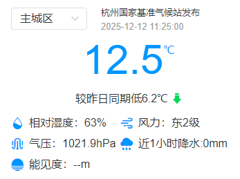 此外,这股冷空气还会带来弱降温,昨天出门还是暖意十足的体感,今天就添上了一点寒凉。今天11:25,主城区气温12.5℃,比昨日同期下降了6.2℃。