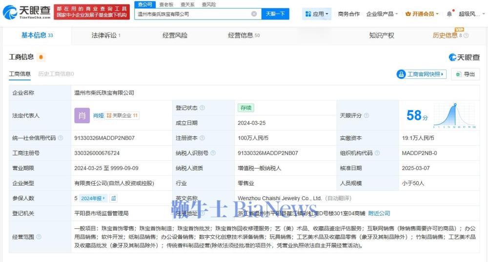该公司成立于2024年3月,法定代表人为肖娅,注册资本100万人民币,经营范围包括珠宝首饰零售、珠宝首饰制造、珠宝首饰批发等。股东信息显示,该公司由浙江柴氏商业管理有限公司、肖娅、柴向前等共同持股。