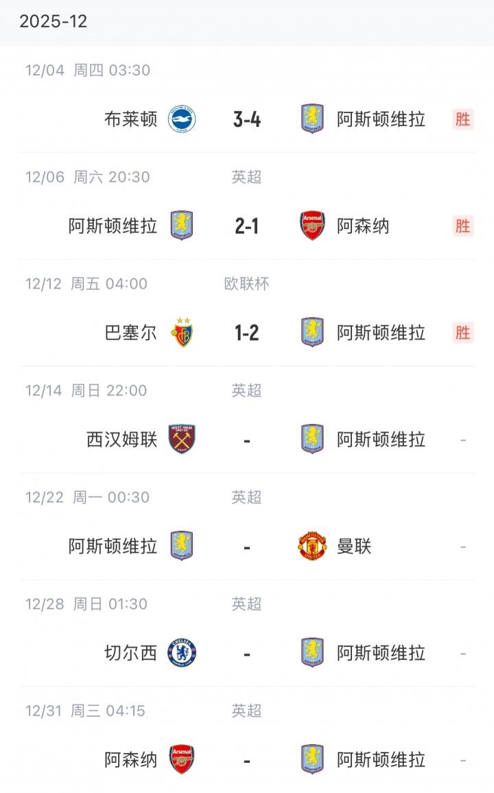 在本月剩余的4场比赛中,维拉将会踢4场英超比赛,分别是对阵西汉姆联、曼联、切尔西和阿森纳,堪称魔鬼赛程。维拉在连续对阵英超BIG6球队的情况下能否延续火热的连胜势头,令人无比期待。