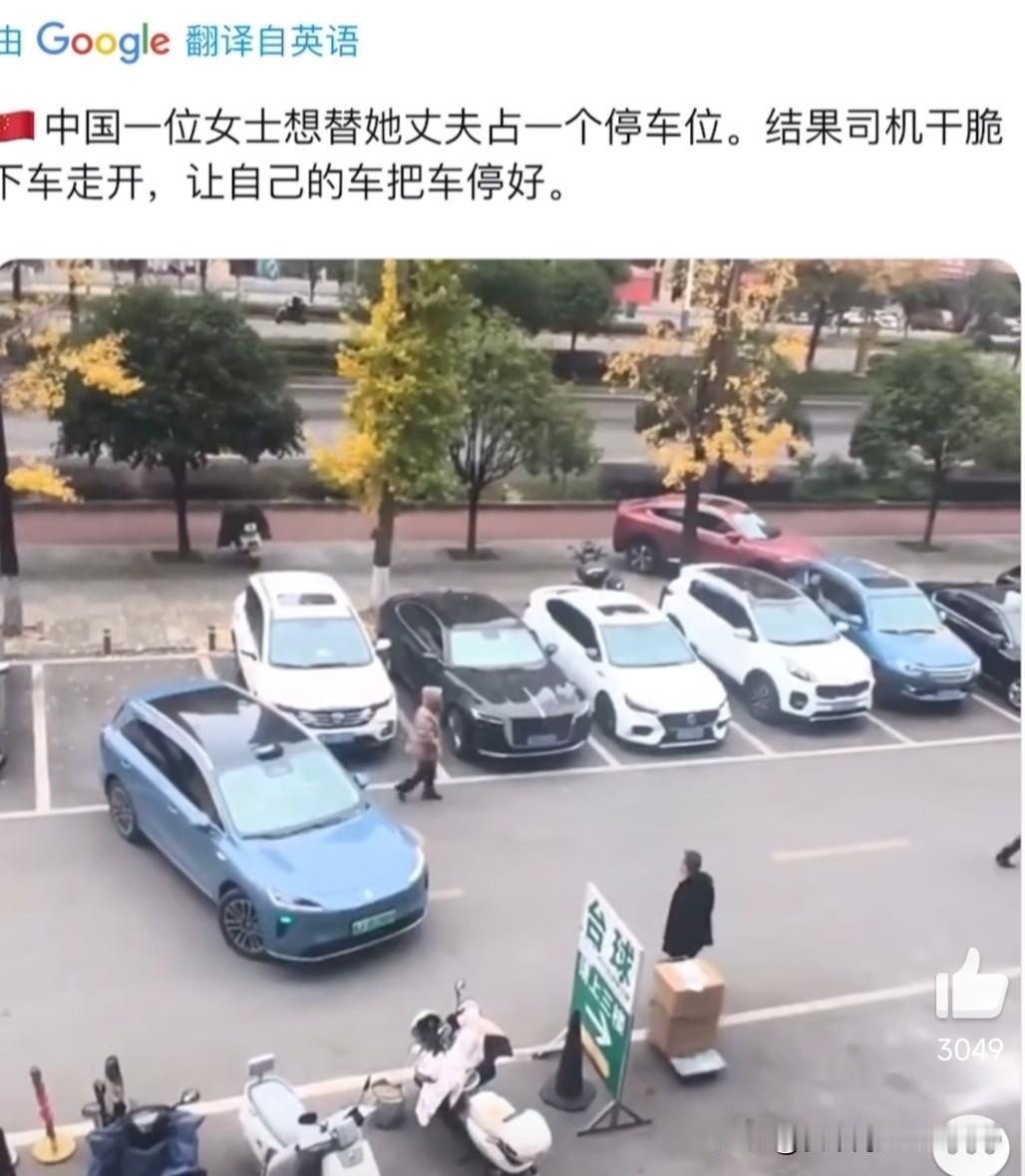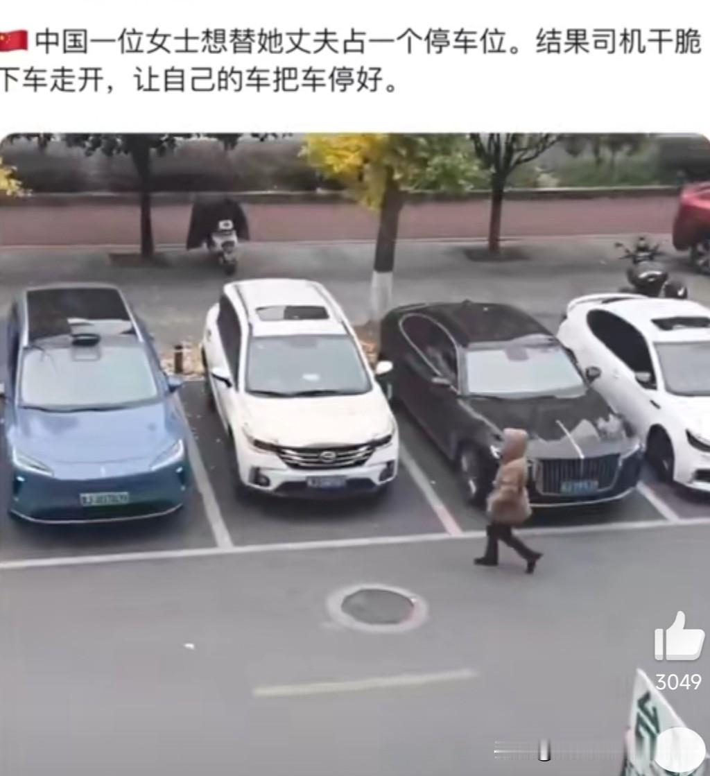 现在城市停车难啊,为了个车位也要“斗智斗勇”。 一位男司机正想将车停入一个空车位,不料一位女士站在该车位中央,原来她正在为丈夫占车位。只见男司机不慌不忙地将车停在车位前方,下车便走。女士见状,急忙追上去,想与他理论。谁知男司机在下车前开启了“自动泊车”功能,就在女士离开车位后,车子缓缓启动,稳稳驶入车位之中。 男司机这一招“调虎离山”,用得真是妙啊! 这真是: 城中泊车难,寸地亦相争。 无车欲占位,费力一场空。 巧设移山计,智取弹指功。 回头车入位,苦笑对引擎。 (图片来自网络)