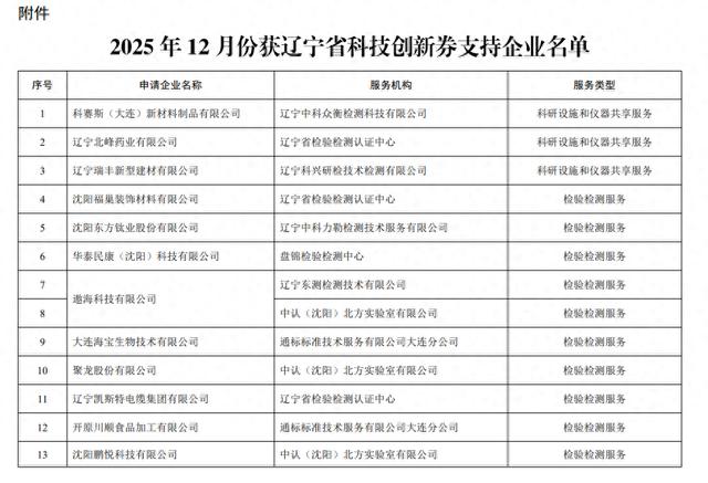 根据《辽宁省科技创新券管理办法(试行)》《辽宁省科研基础设施和科研仪器开放共享服务科技创新券实施细则(试行)》等有关规定,经有关单位申报、初审推荐、复审核查、辽宁省科技厅党组会审定等程序,日前,省科技厅对2025年12月份获辽宁省科技创新券支持的13家企业名单进行公示。