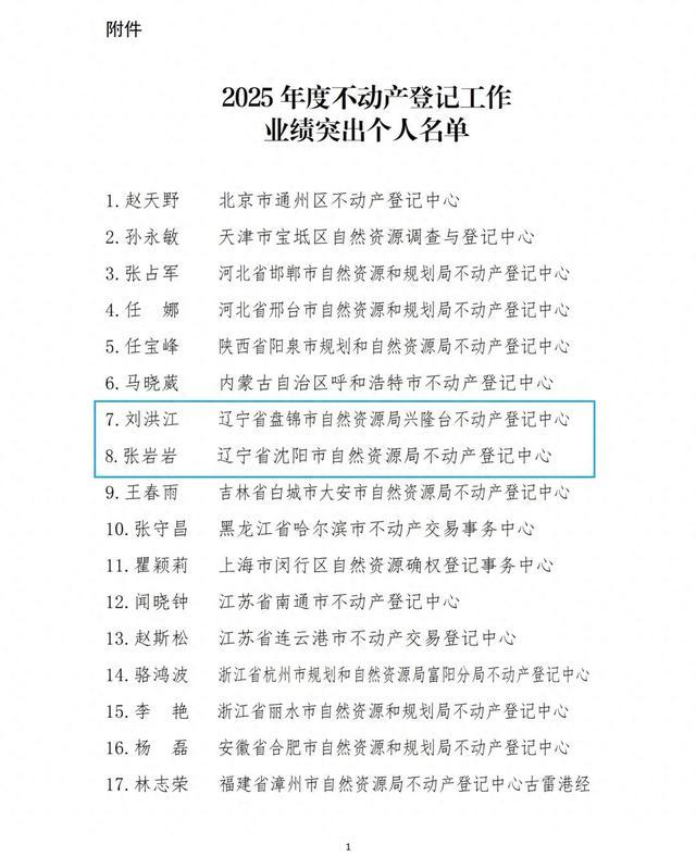 近日,自然资源部公布了2025年度不动产登记工作业绩突出个人名单,并予以通报表扬。我省盘锦市自然资源局兴隆台不动产登记中心刘洪江、沈阳市自然资源局不动产登记中心张岩岩入选。