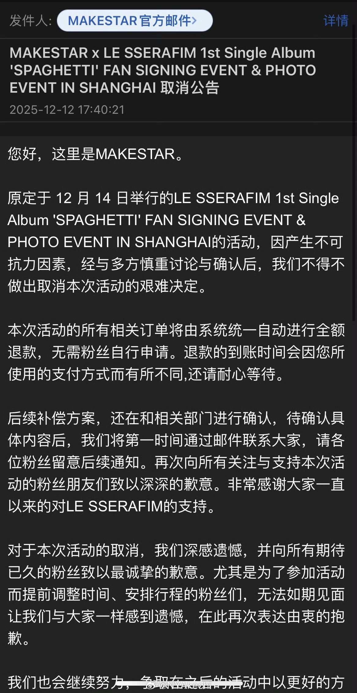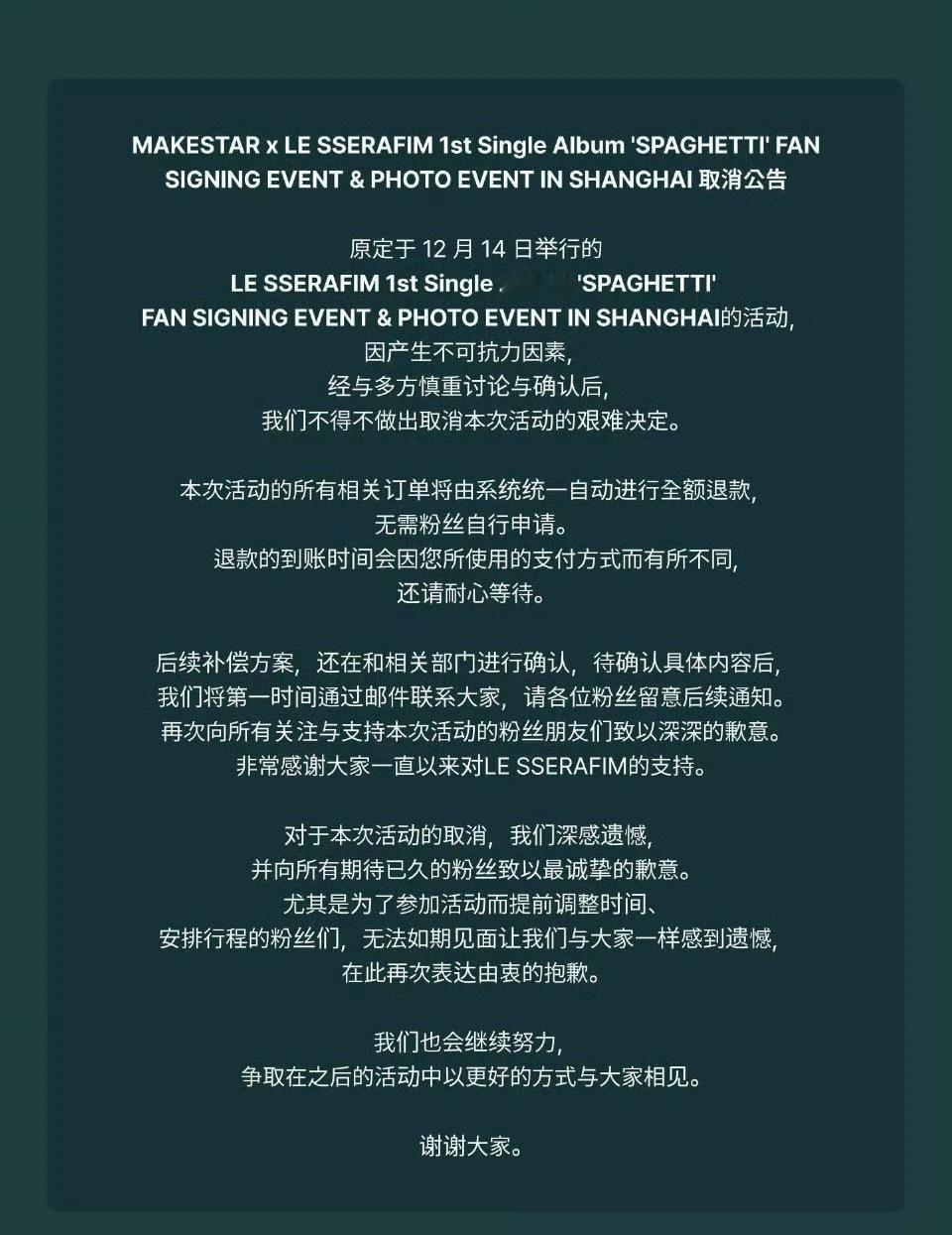 继 NCTWISH后LESSERAFIM本周日上海签售也因不可抗力取消 疑似因队