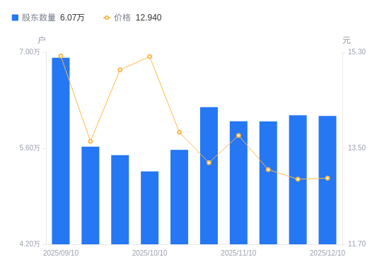 日期A股户数(户)流通A股户均持股数(股)户均持股市值(万元)2025-12-106071519638.5725.412025-11-286080519609.5125.342025-11-205991119058.4324.972025-11-105995017299.6023.772025-10-316199116730.0222.132025-10-205575916329.5922.532025-10-105262617301.7426.332025-09-305498816558.5524.792025-09-195622916192.1222.072025-09-106921113154.9420.03