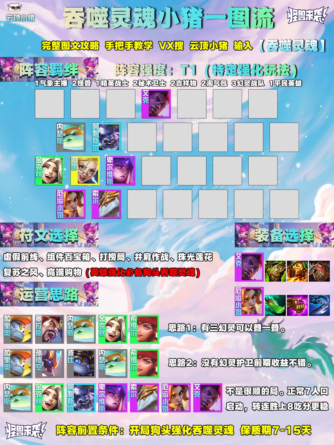 前期二吉祥物打底,然后拼三幻灵可以叠一叠幻灵属性增加上限,如果没有则用护卫牌前期打工会比较厉害。