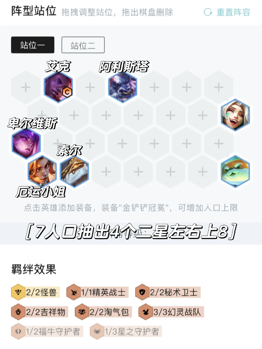 过渡到7人口这个版本就必须抽牌了,正常是抽出3-4张二星怪,然后关键牌差不多能一星锁血然后就上8,如果开局特别胡7连胜以上也能直接上8人口抽牌。