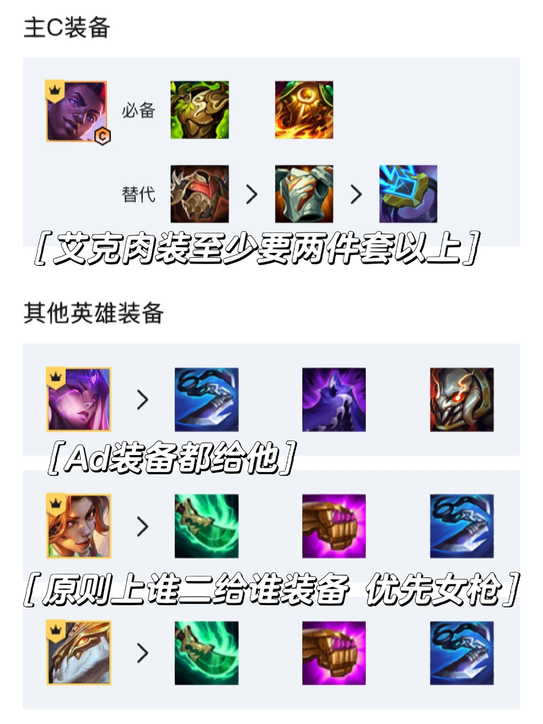 [草莓R]装备思路:这套阵容艾克肉装必须两件套以上,不然容易翻车,卑尔维斯、女枪/龙王一人再两件套,收益分散一点,卑尔维斯是单体爆发可以加速获得吞噬效果。