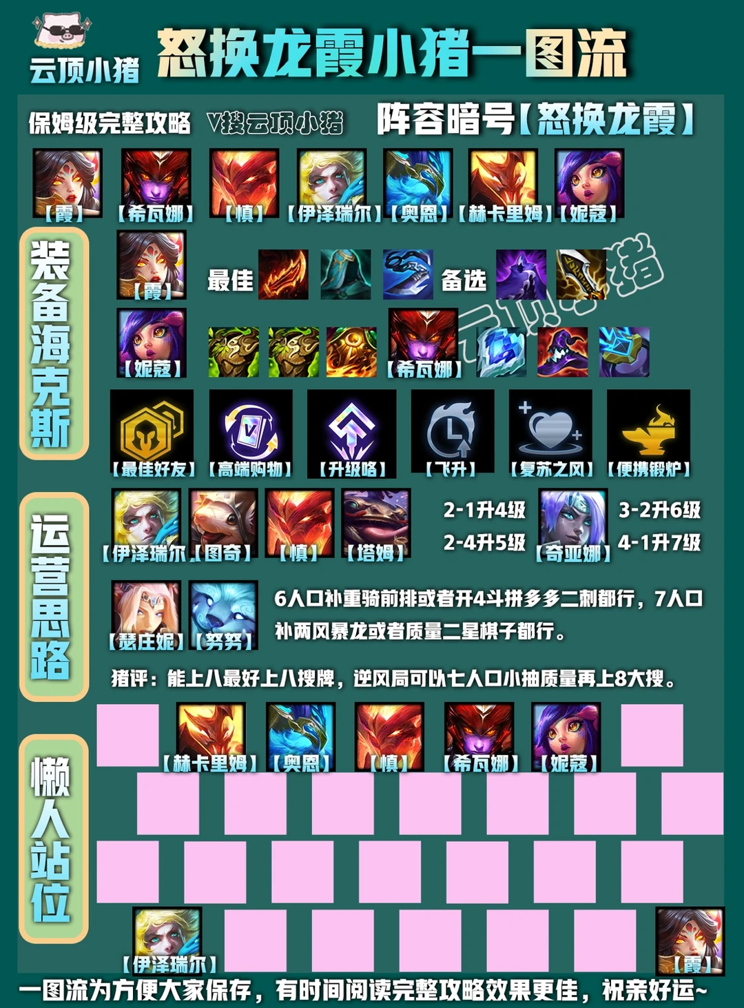 [暗中观察R]分析:这个后期根据来牌可灵活和冒险刀霞互转,龙女的高爆发配合上霞遇到二星龙神都有机会直接秒杀。