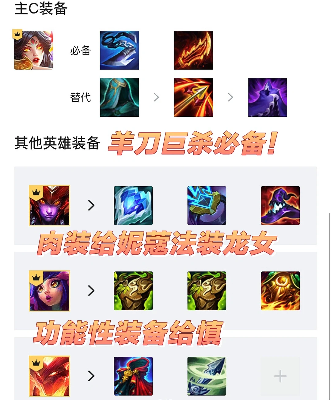 优先做羊刀和巨杀,这是必备的。其次第三件最好是水银,其次夜刃,分裂箭也行。然后肉装全部给到妮蔻,AP输出装则给到龙女,直接配合霞秒对面后排。