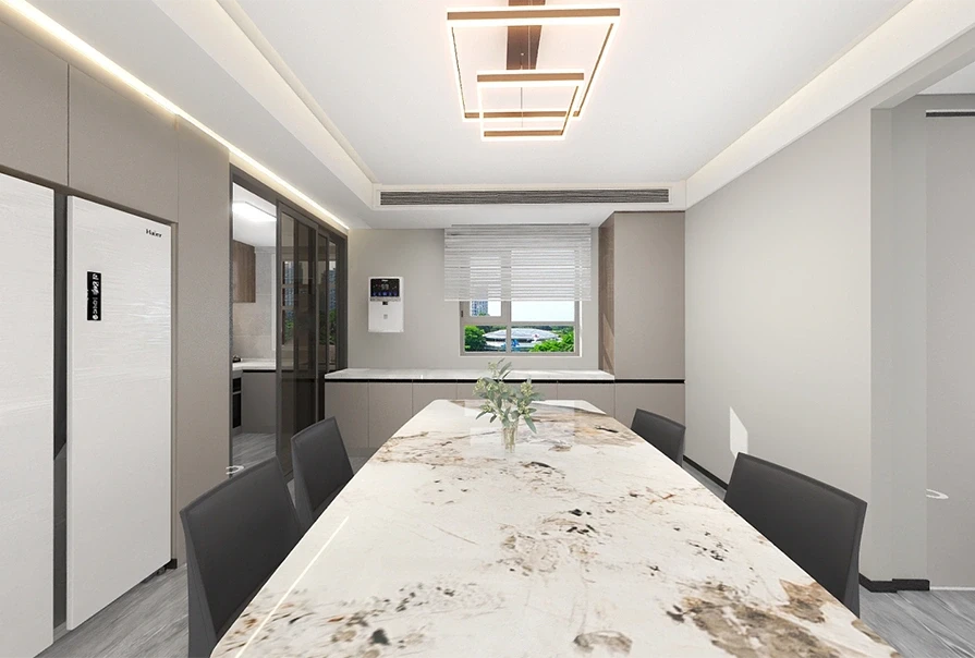 🌹客餐厅一体化的设计,作了通铺瓷砖,承载着空间的延伸,提升客厅与餐厅之间的层次感。长方形岩板台面搭配着皮质靠背椅,而魔豆分子的个性创意线条灯给餐厅简洁的空间带来一丝雅致。