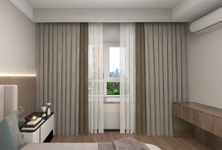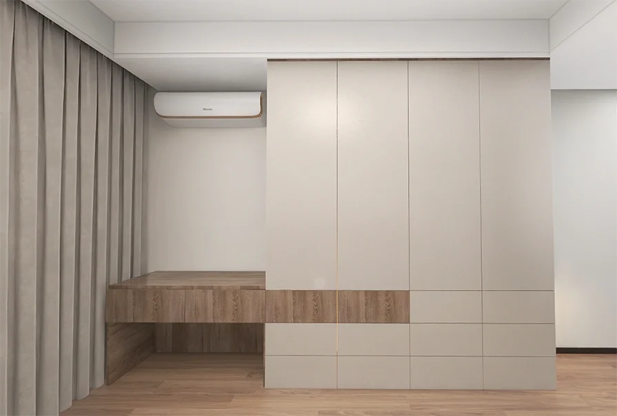 🌹主卧的设计简约舒适,柔软的布艺床适合休息,梳妆台与通顶衣柜一体的设计既节省空间是空间具有整体性,又满足了日常收纳的需求。