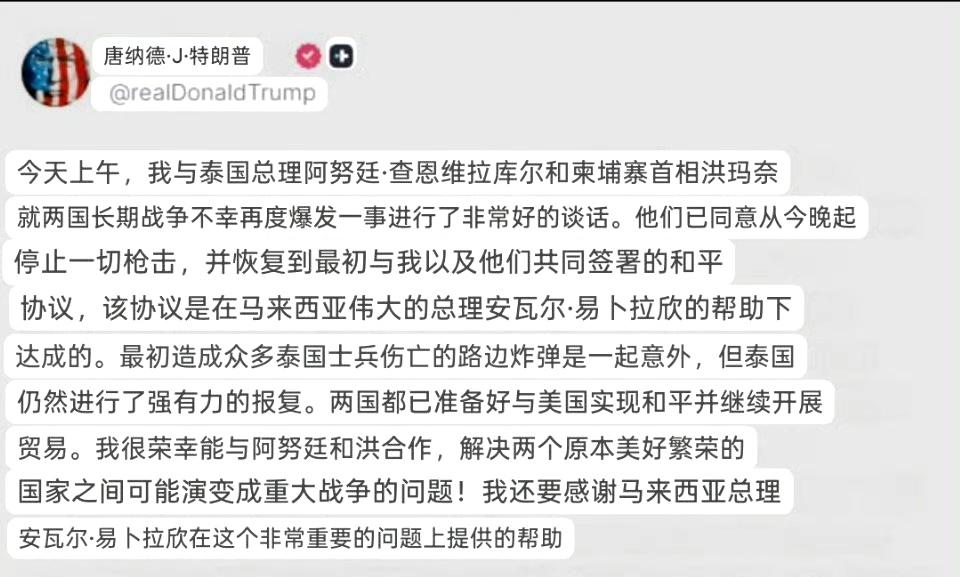 特朗普声称泰国与柬埔寨同意停火,并恢复原有和平协定。