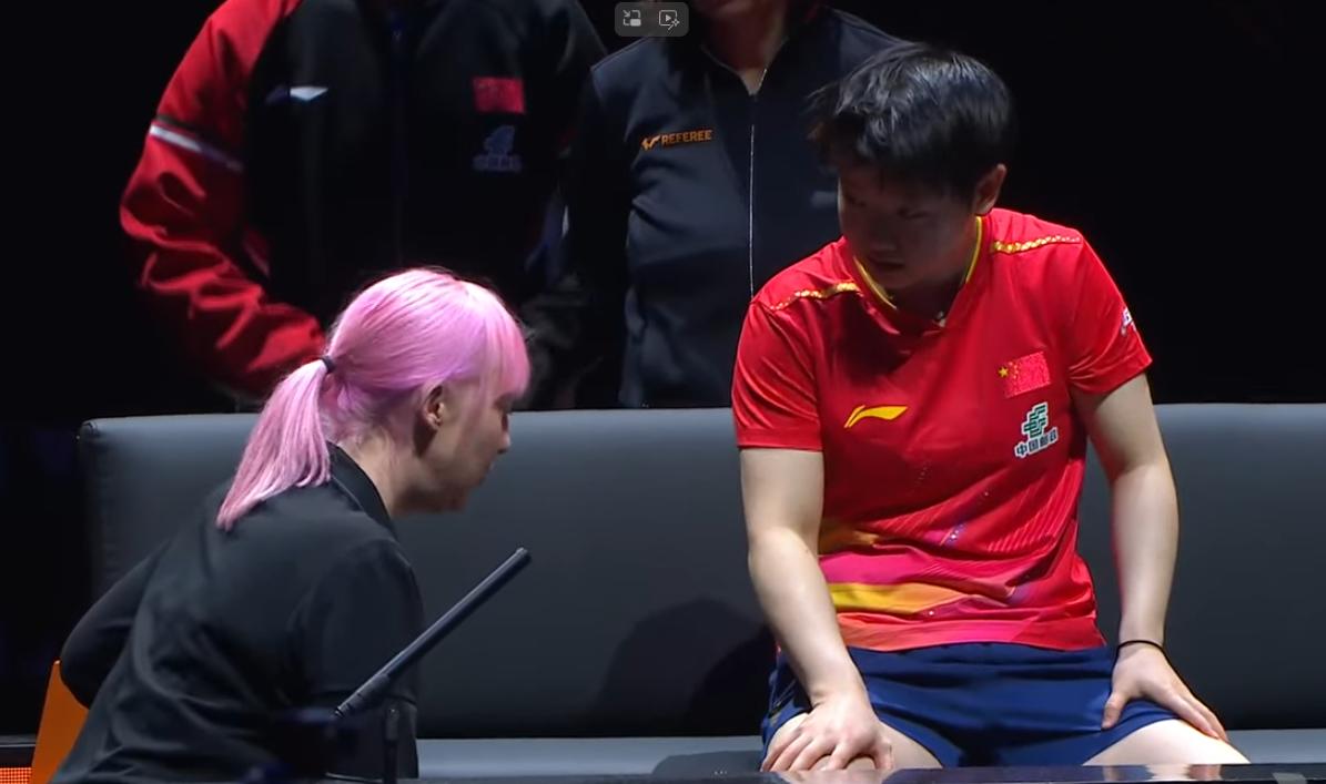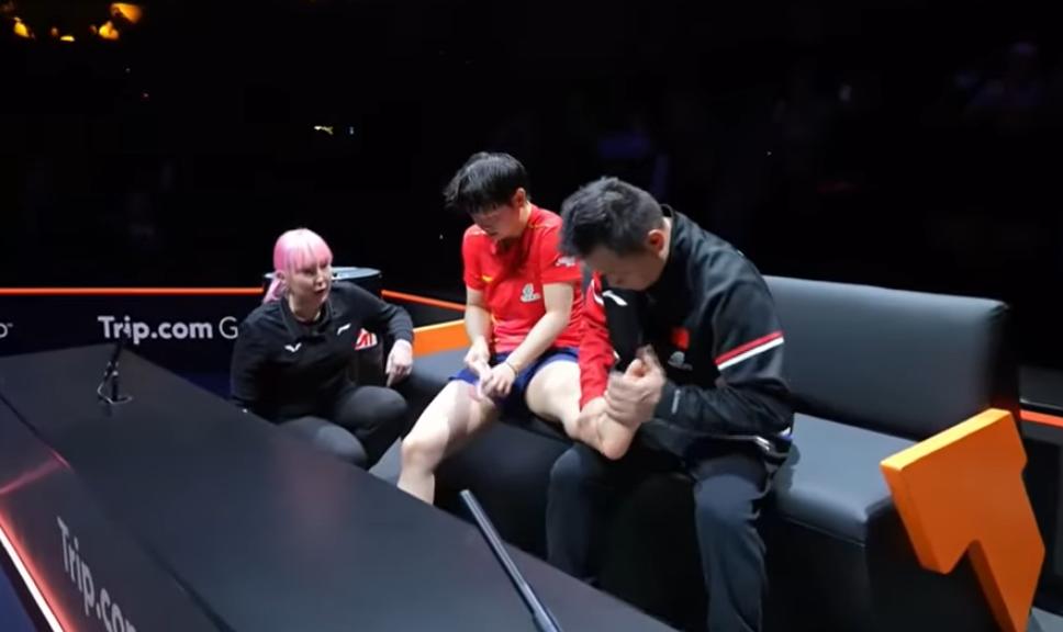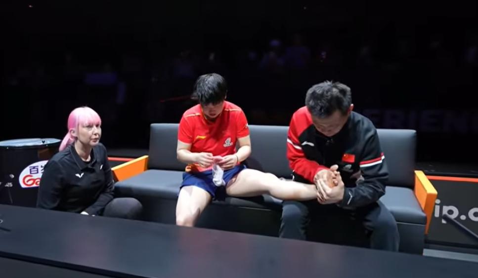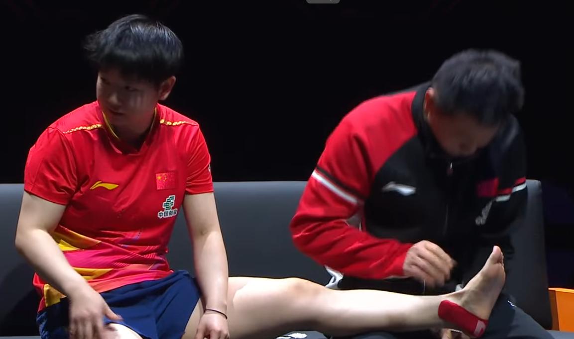 突发!孙颖莎受伤了, 本来想贴个肌肉贴, 工作人员都不同意吗? 德华都快急眼了。 莎莎去问了裁判, 这才同意了, 而且不让德华单独给莎莎处理, 安排了一个队医看着。 莎莎应该是踝关节受伤了, 哎一天三赛, 太辛苦了。 建议莎莎打完这场, 好好休息一下吧。