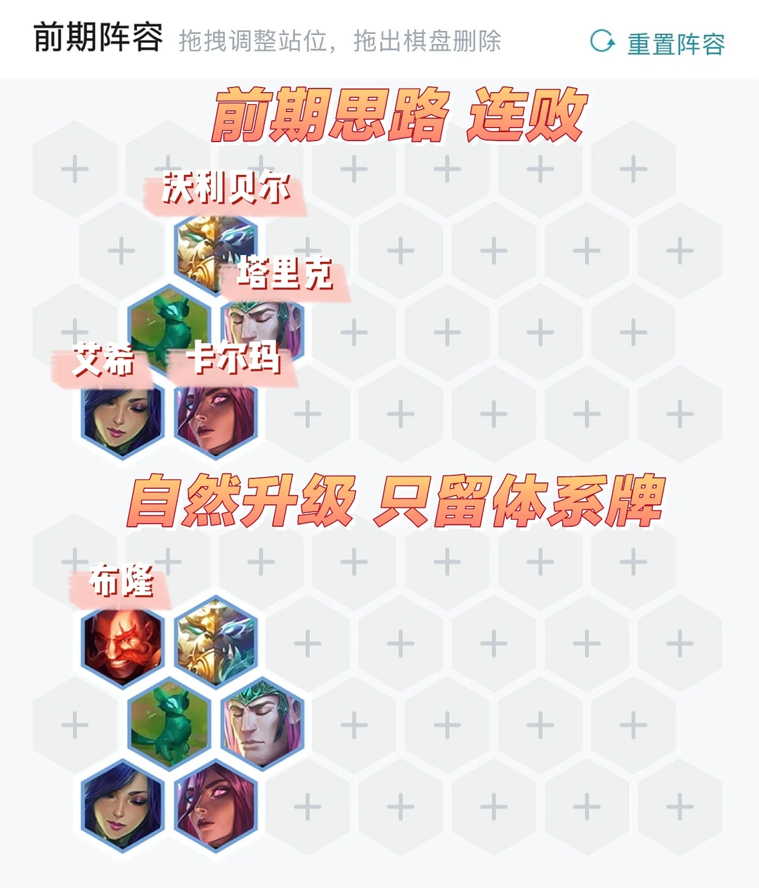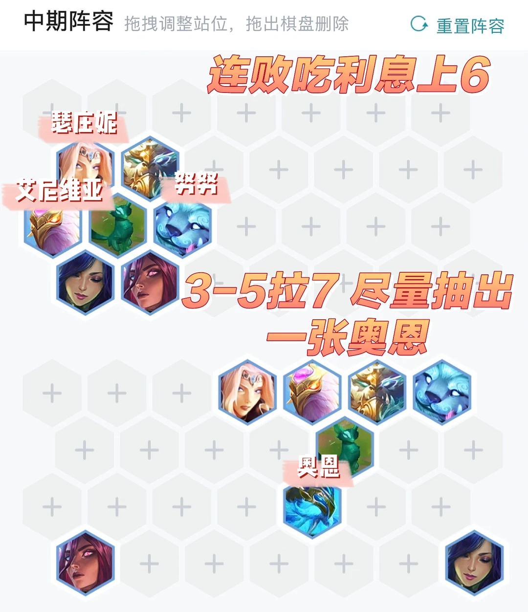 一般推荐连败到3-5拉7抢牌,一张奥恩即可停手。
