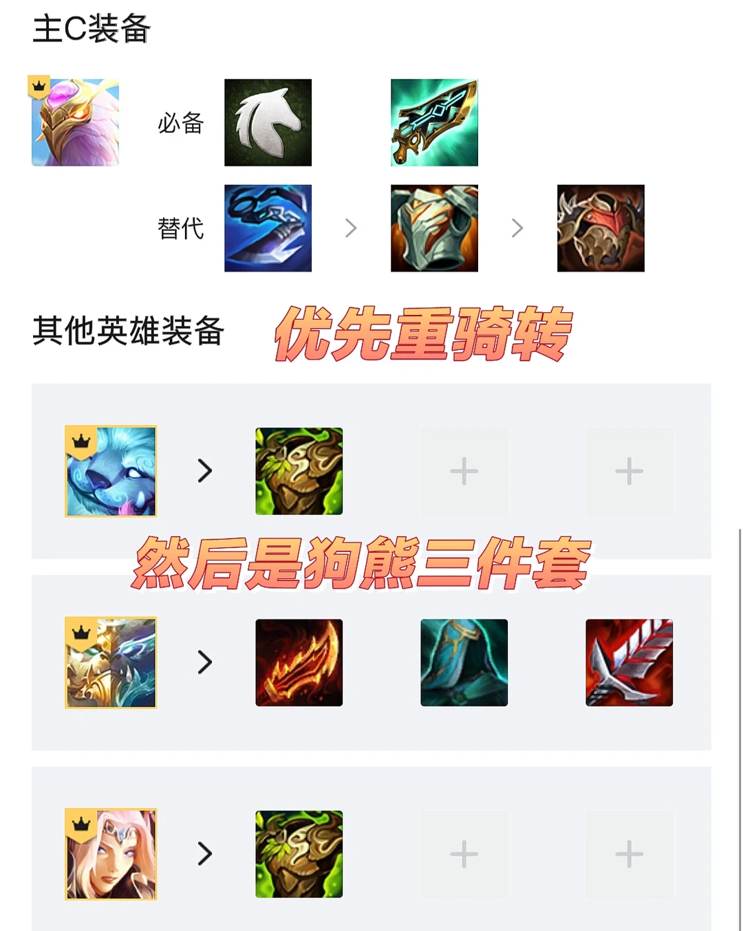 优先考虑凤凰的重骑转和狗熊的三件套。凤凰实在没有重骑转就做板甲、反甲这种肉装还是顶前排,祭品的装备优先狂徒。