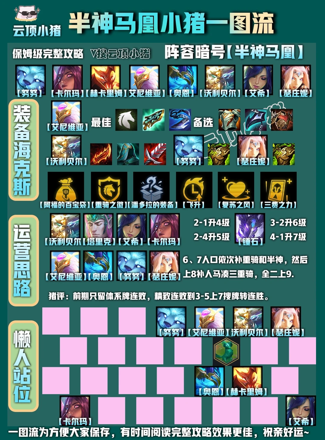 连败到3-5拉7启动,抽到一张奥恩即停手,4阶段抽出二星凤凰和狗熊,搭配三半神重骑几乎可以无脑连胜,然后8人口阵容全二即可上9,如果牌来的特别多,一般不追三。