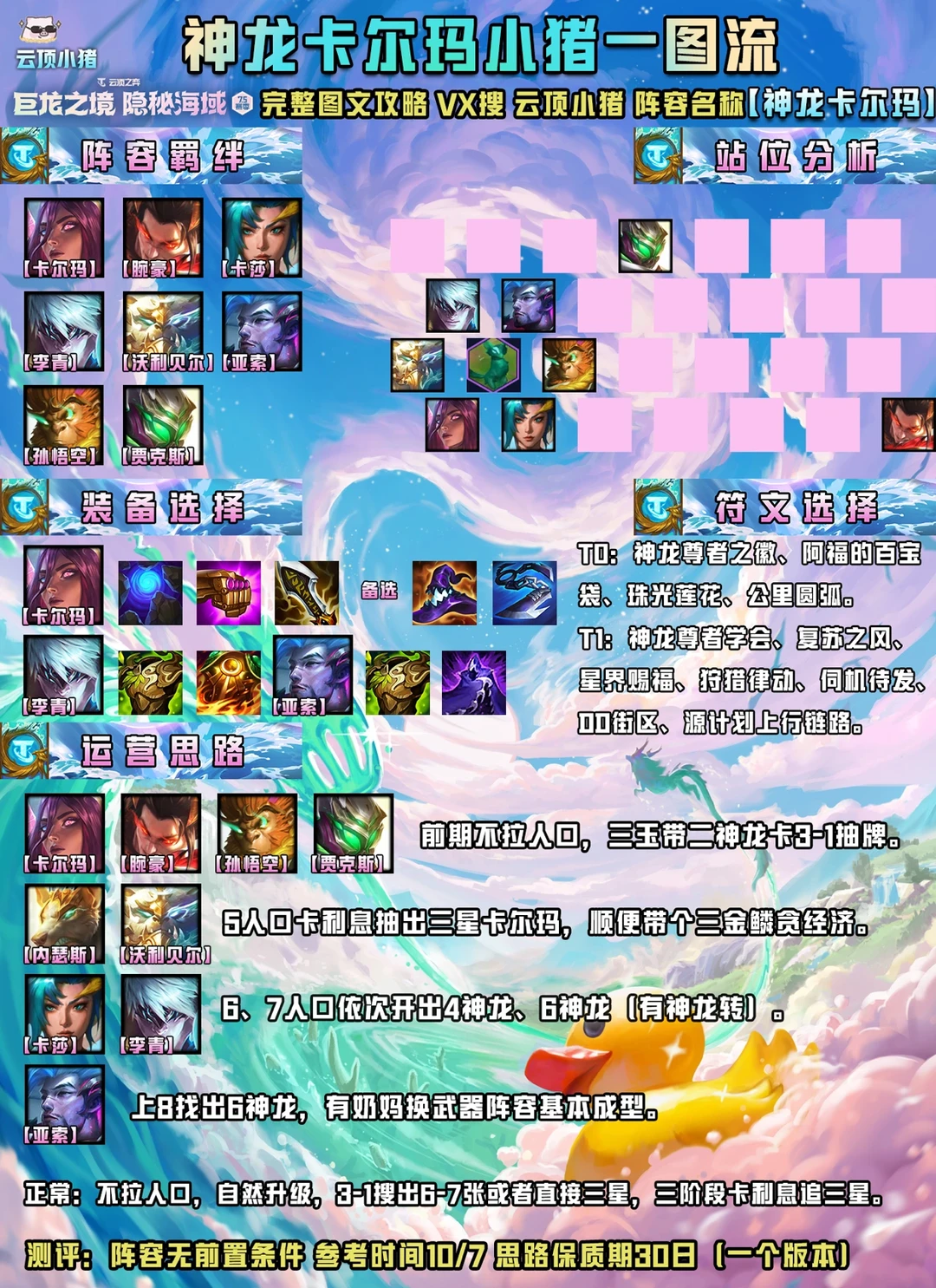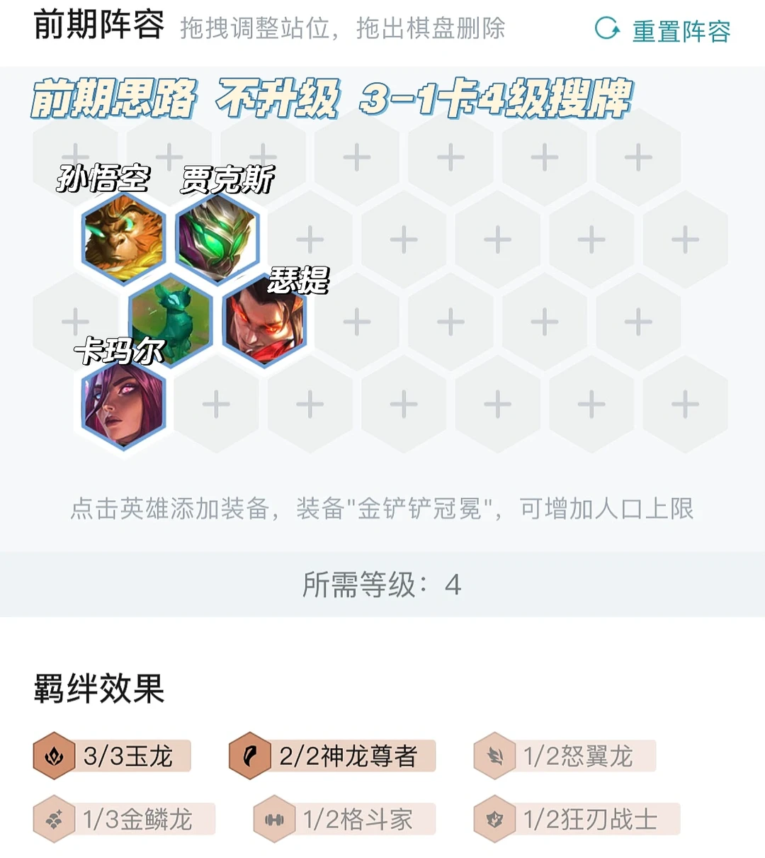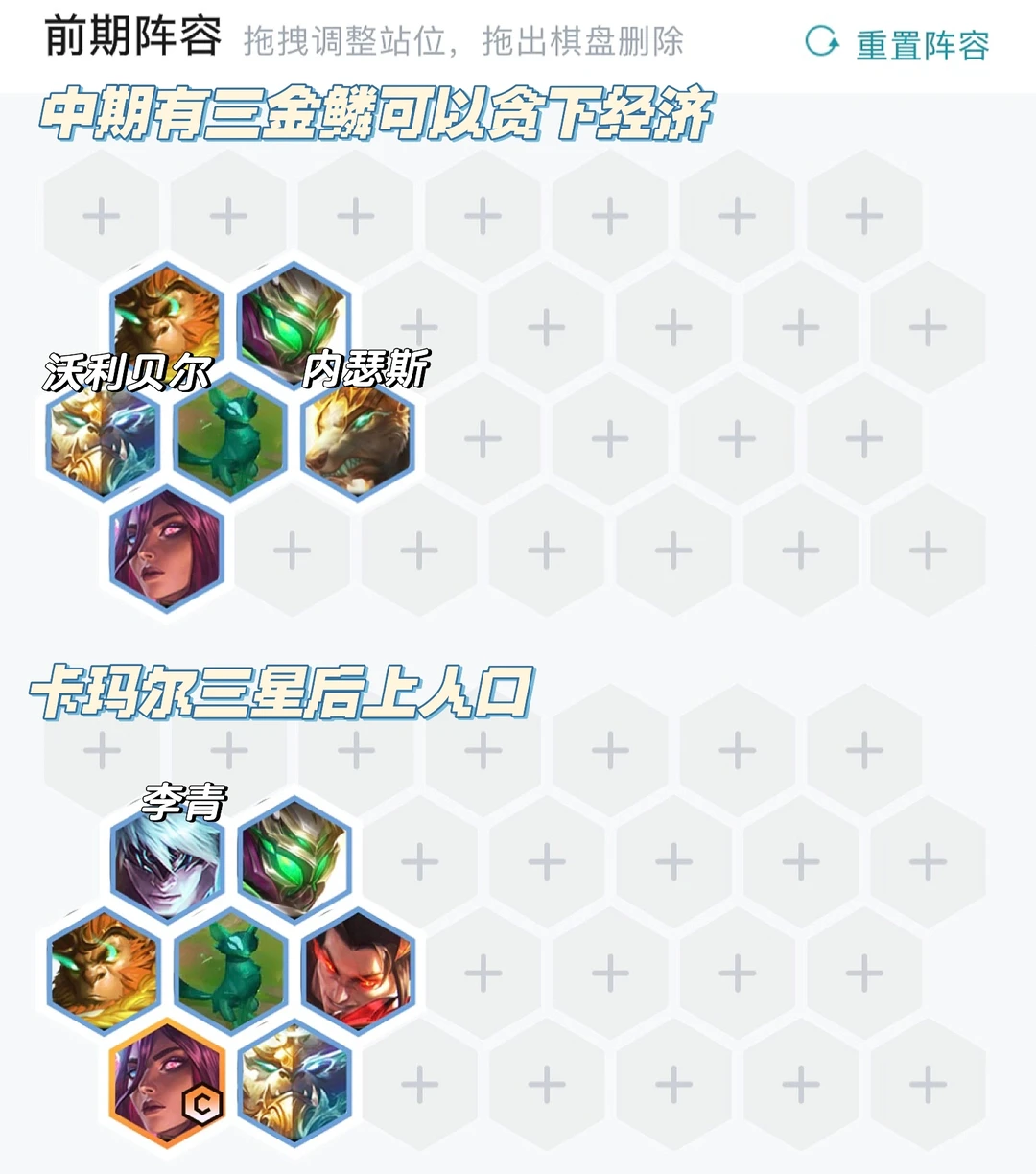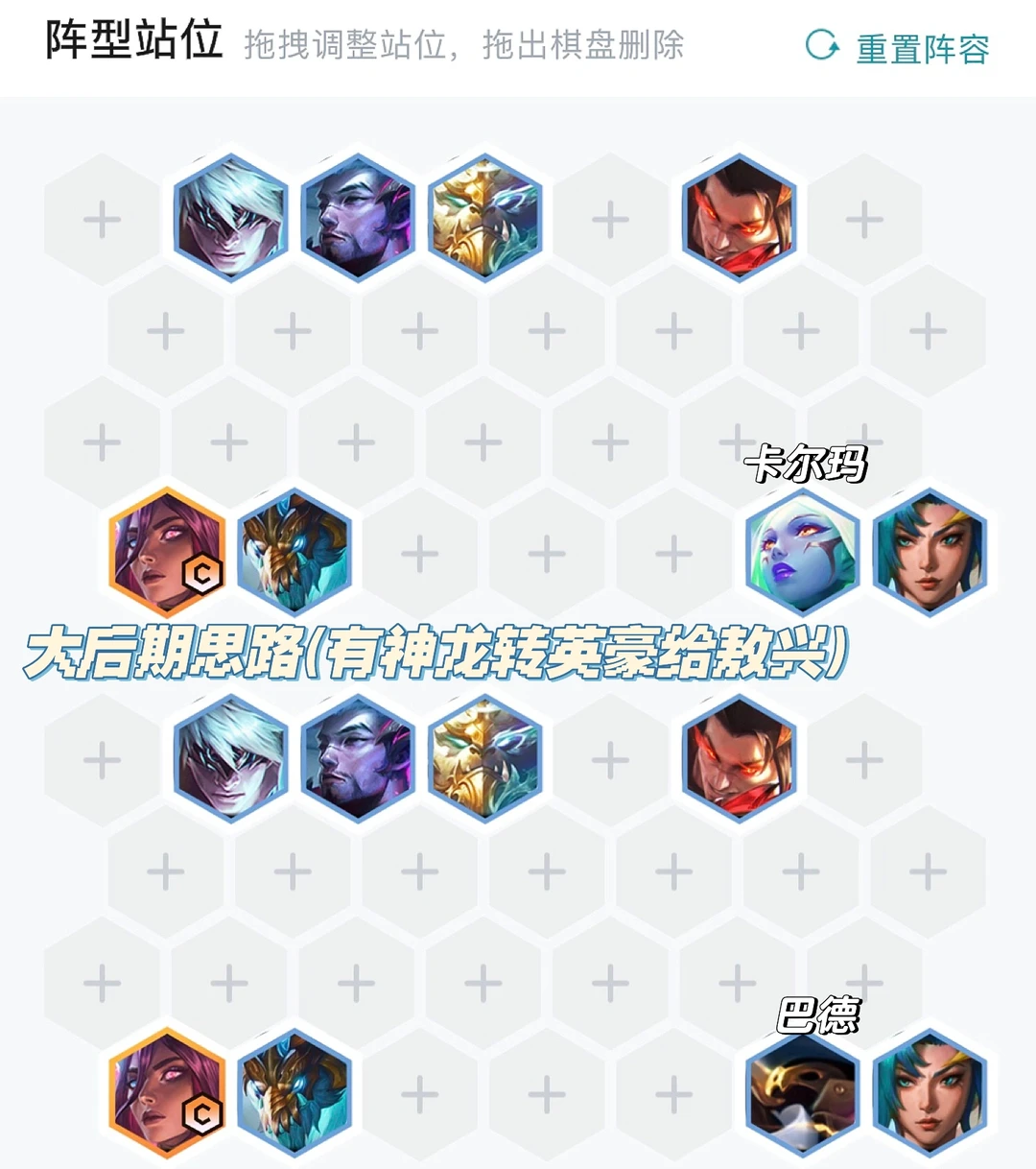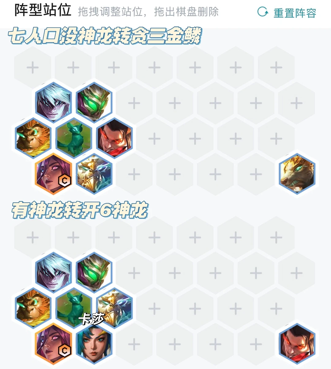中期三阶段卡利息追三星卡尔玛,有三金鳞则带三金鳞吃吃经济,然后又神龙转铲子都可以拿,尽早开出六神龙。