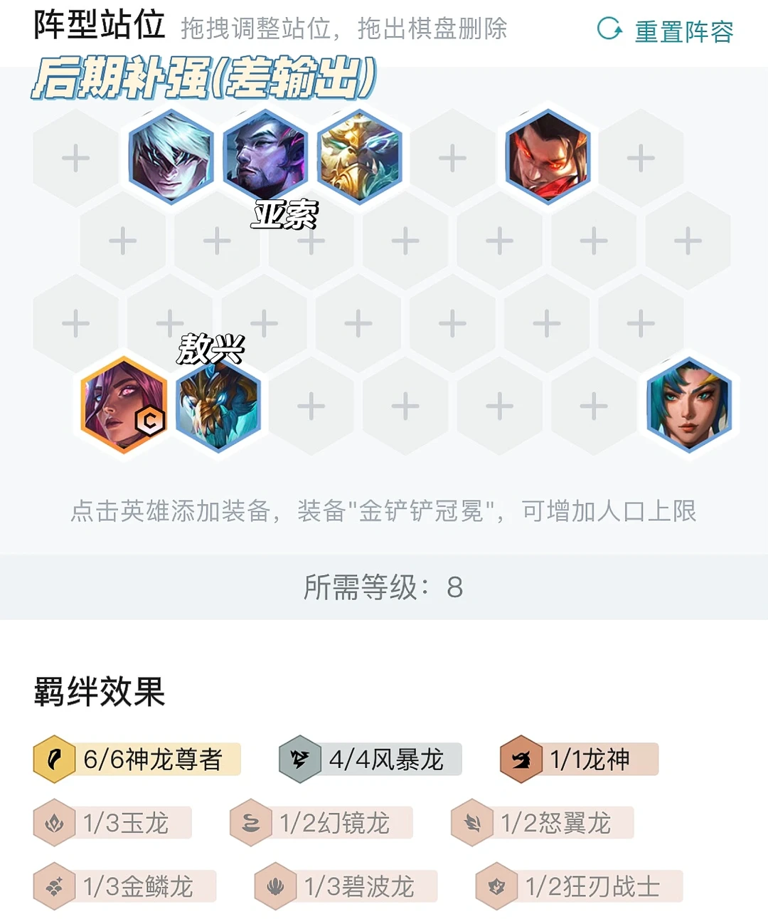 这套阵容装备要求是非常高的,所以开局是法装再去玩。另外后期是比较缺输出的,最好是补龙神或者大连胜卡尔玛都能卖转四神龙九五也是没问题的。