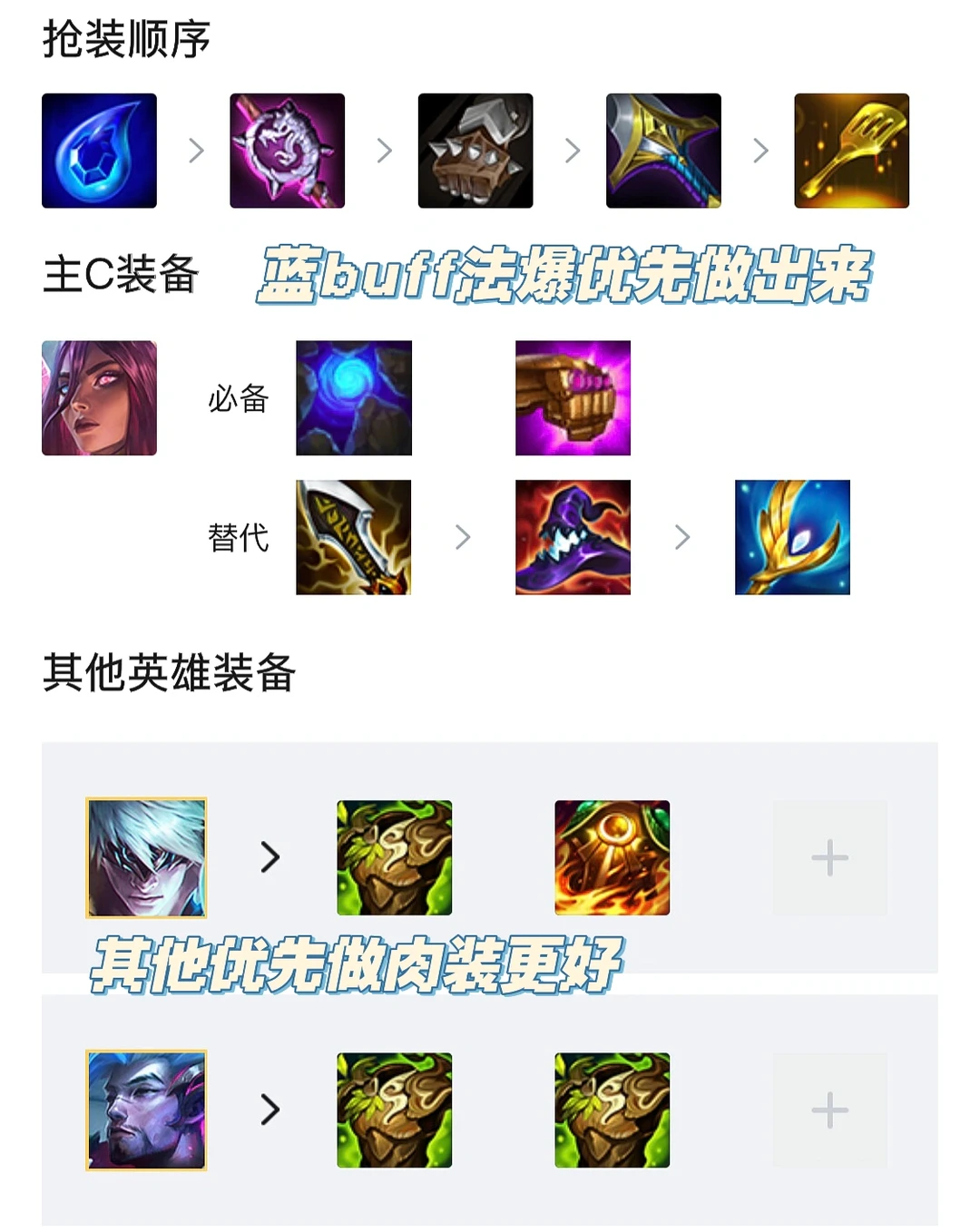 装备思路:蓝BUFF法爆是卡尔玛最契合的装备,这两件一定要保证,有珠光尽量补无尽。其次去做前排装,这套阵容没有大前排所以需要多做肉装弥补。