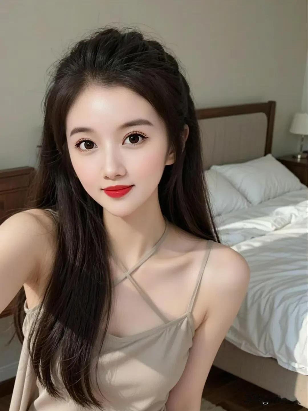 浅杏吊带的交叉肩带勾着慵懒,长发松松垂在肩头。晨间阳光漫过床沿,衬得唇上那抹红更
