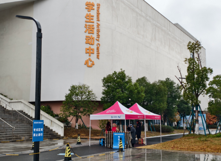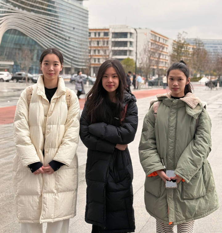 潘同学是浙江理工大学临平校区时装表演艺术专业的大一学生,这次有同机构的学妹来参加考试,到考点外等待迎接。