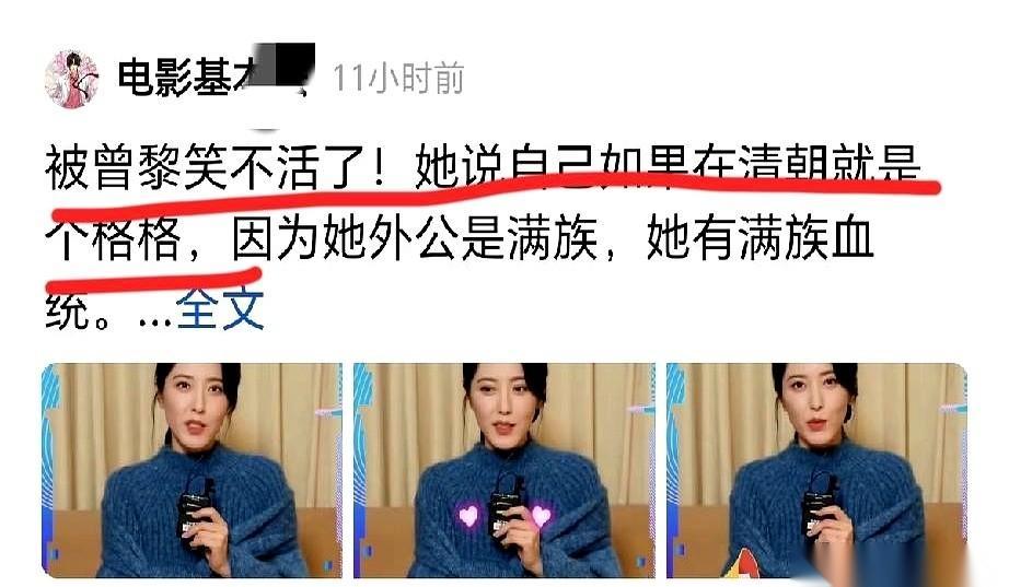 刷到个消息,差点没把我笑死。 大美女曾黎说,要是在清朝,她就是个格格。 理由是:她外公是满族。 我当时就愣了,这什么逻辑?外公是满族,自己就能当格格? 那我外婆还是当年村里的一枝花呢,我是不是就该是王子了? 果然,评论区马上就炸了。 一堆“历史学家”拿着放大镜下场,开始科普什么叫父系传承,什么叫宗亲,什么叫正黄旗……那架势,比人家修家谱还认真。 说真的,我觉得这事儿特没劲。 人家一个女演员,大概率就是开了句玩笑,跟咱们小时候披着床单幻想自己是公主王子,一个意思。谁还没做过白日梦啊? 可就有那么些人,非要把一句玩笑话,当成什么“炫耀血统”的铁证。 然后,画风一转,又开始对着几百年前的大清口诛笔伐,那股子劲儿,好像自家昨晚刚被抢了什么宝贝似的。 醒醒吧,大哥们。 大清都亡了多少年了。 现在户口本上写着啥,咱就是啥,56个民族早就是一家人了。 有那功夫去翻老黄历、搞对立,真不如琢磨琢磨下个月的房贷怎么还。 那玩意儿可比当个“假格格”,要现实多了。