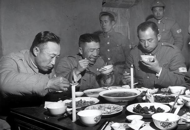 这张照片拍摄于1948年11月淮海战役期间,是美国记者西默·托平记录下的国军13兵团指挥部用餐场景。 左起的李弥(13兵团司令官)正拿着汤匙盛汤,中间的赵季平(副司令)吃饭时表情拧成一团,像是塞了牙,又像被饭菜烫到,歪着半边嘴扒饭的样子透着股滑稽;右边的王伯勋(39军军长)则安安静静地捧着碗,看着腼腆又斯文。 桌上点着两根蜡烛,显然是夜间用餐,也可能是躲炮弹的避光屋,摆着六菜一汤,甚至还有美国“骆驼牌”香烟,这规格在战火纷飞的前线,实在算得上奢侈。 连拍摄这张照片的美国记者都直言“国民党必败无疑”——后来李弥的13兵团果然在淮海战役中覆灭,他本人也只能乔装逃脱。